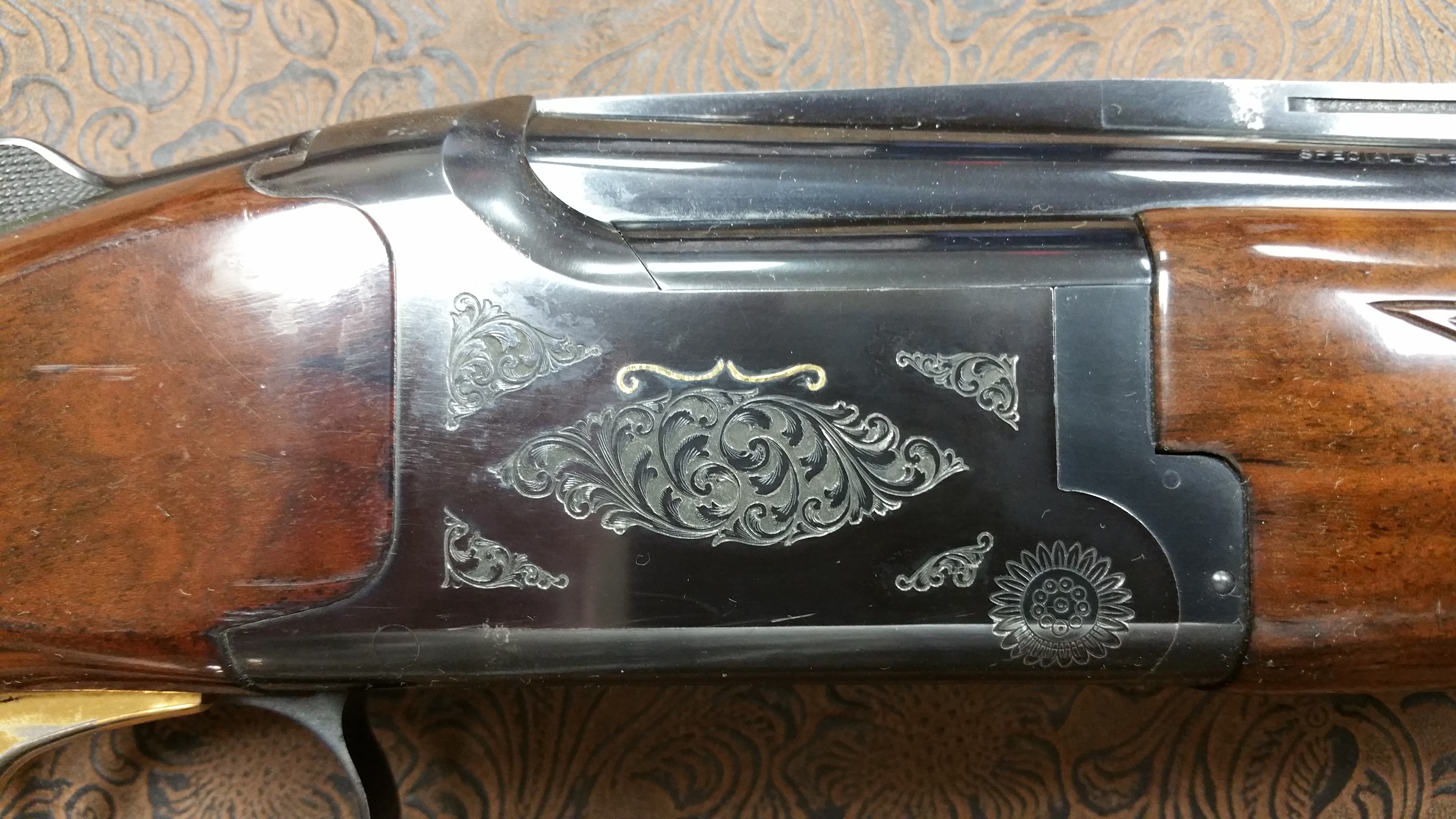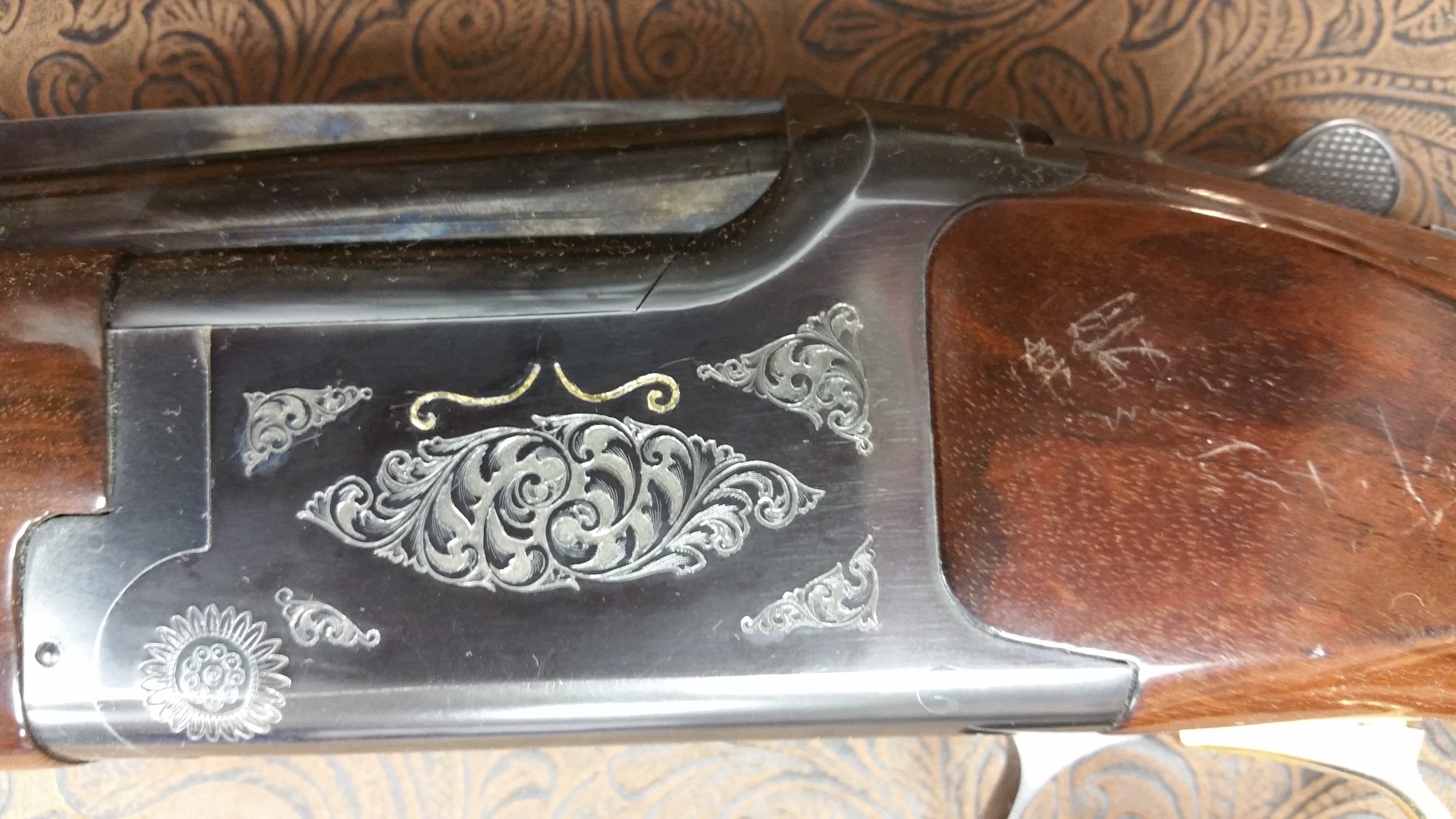 He came into my shop with the Browning and we talked over how to make this a special treasure for his son. This Citori is an older gun made in Belgium, an over and under 12 gauge shotgun with manufactured engraving which was rolled/stamped onto the receiver. The engraving is beautiful but very light and the surface flat and smooth.