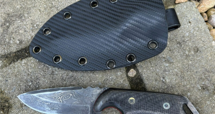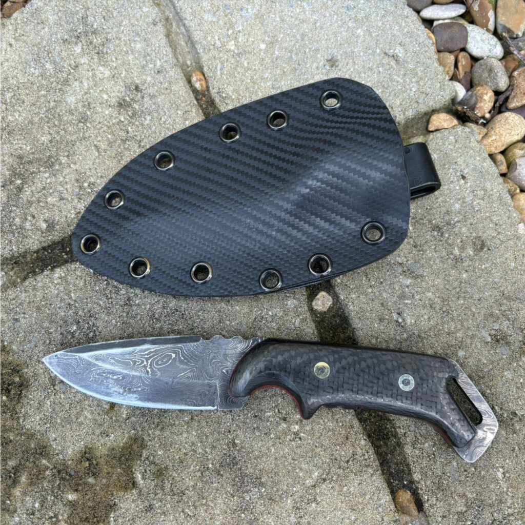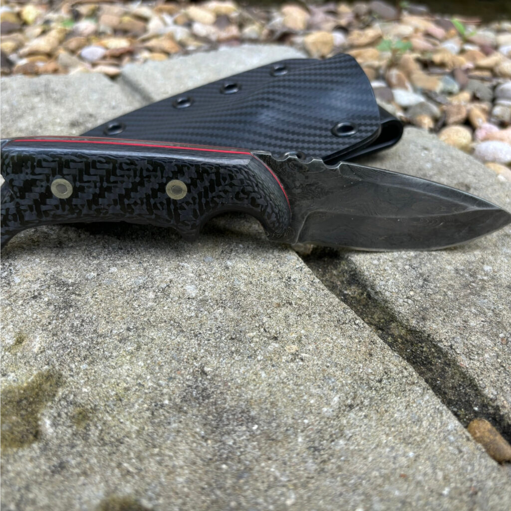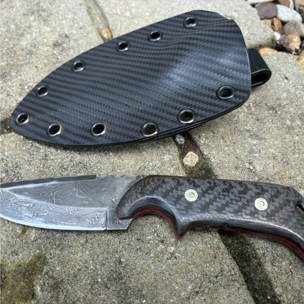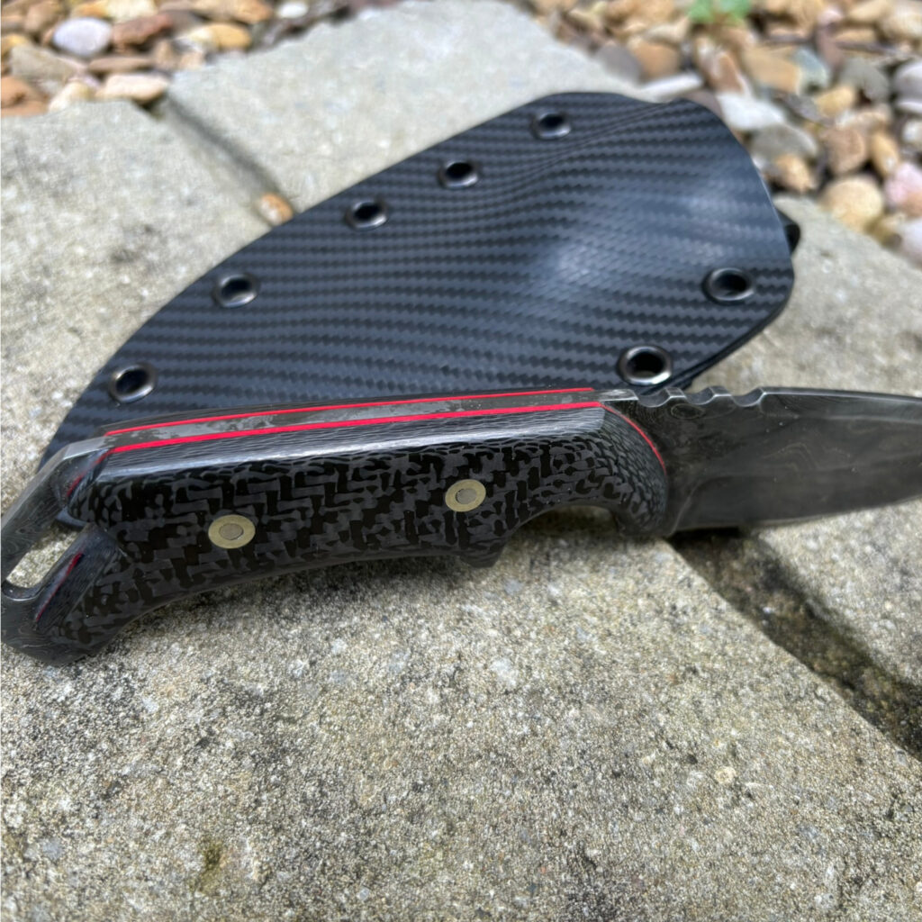 Carbon Fiber & Damascus Steel Knife with Kydex Sheath Carbon Fiber scales red felt liners and Damascus Steel. Fitted tactical sheath in Kydex.