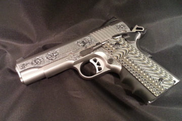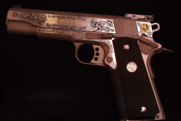 This is a Colt Gold Cup Trophy Model 1911 and the customer had seen one of my guns at a gun show and then they showed up out of the blue with the Colt and wanted to know if I could engrave it.