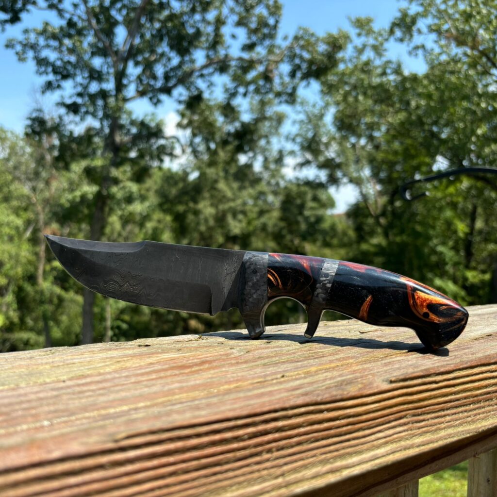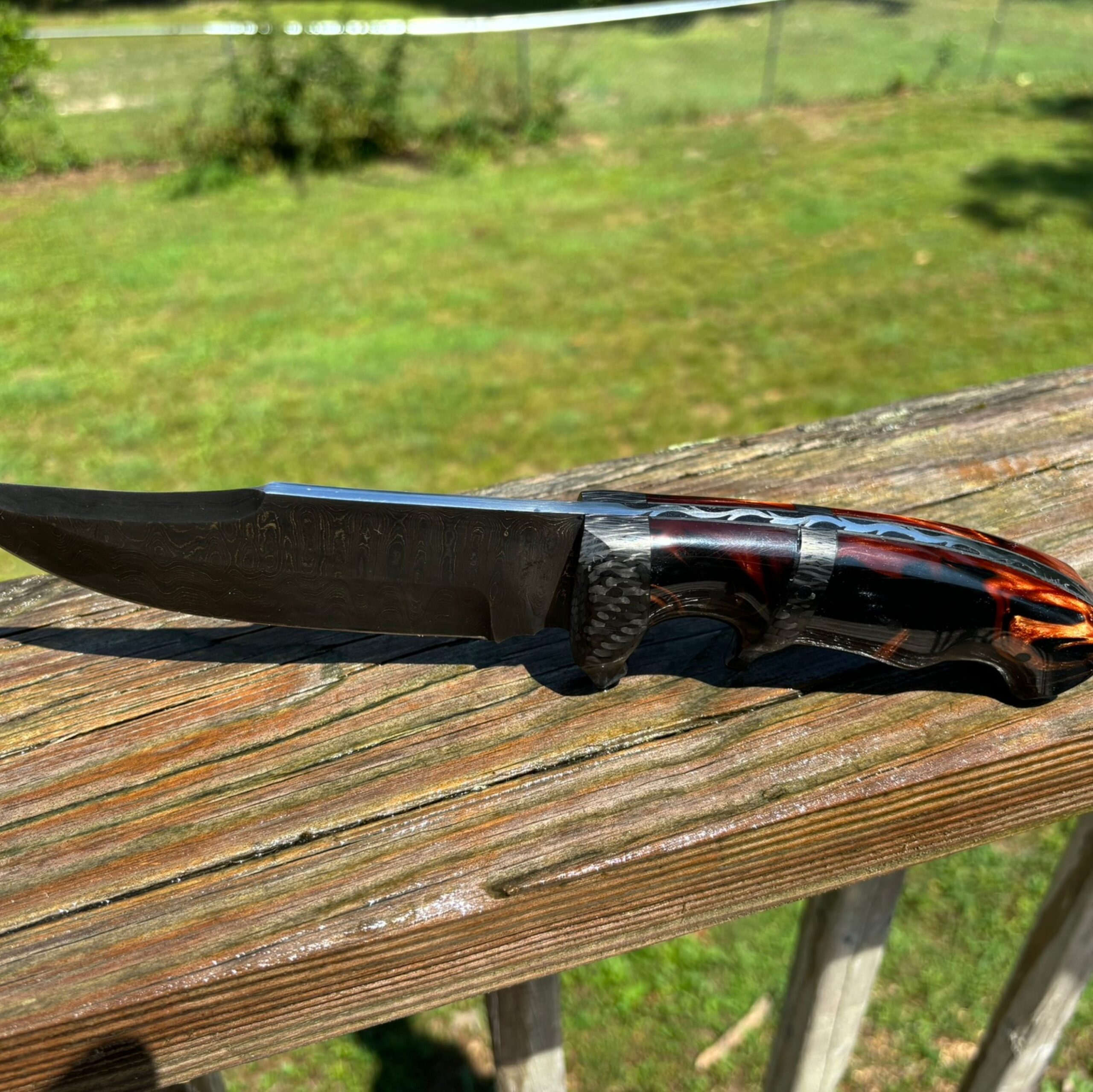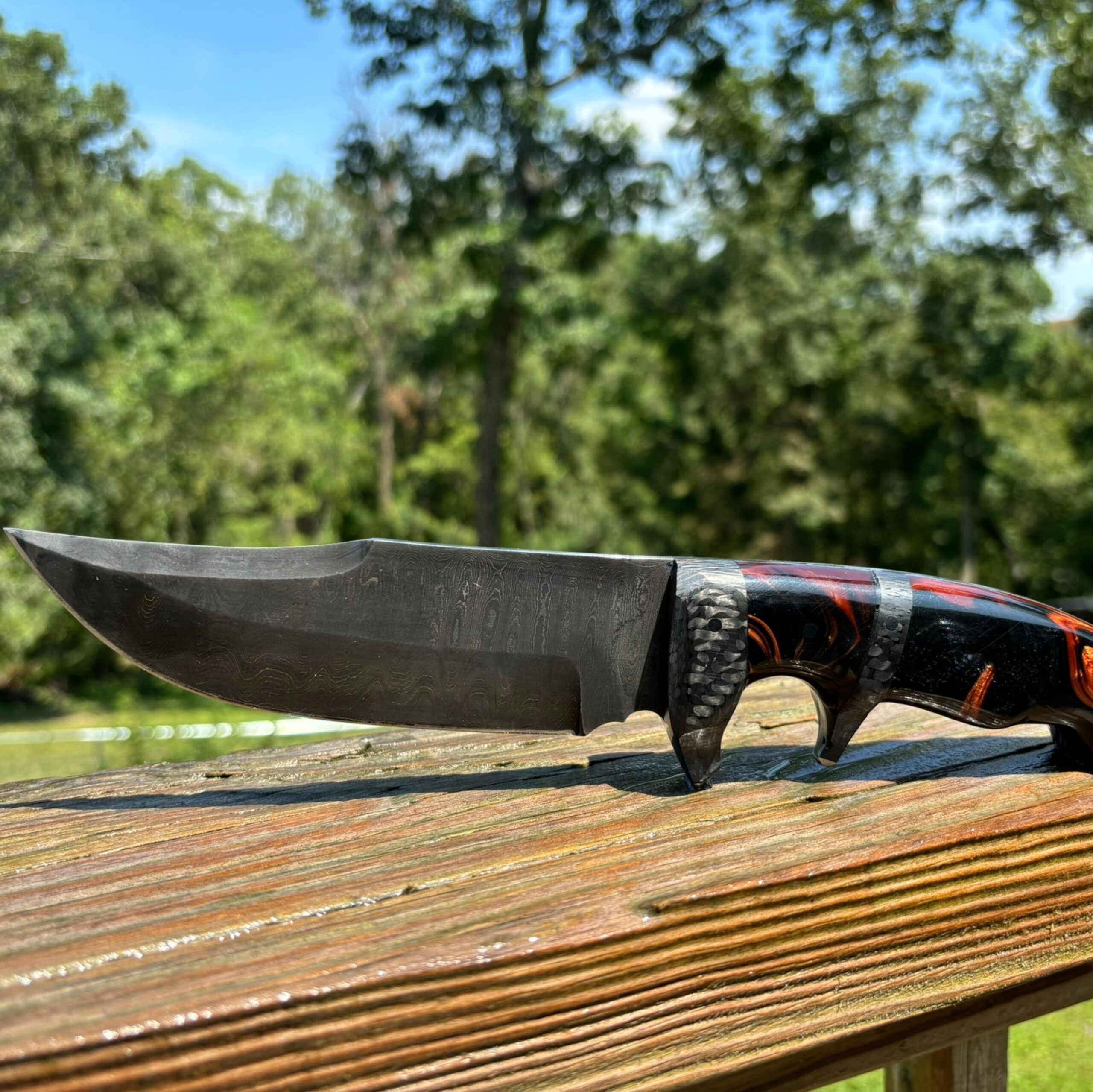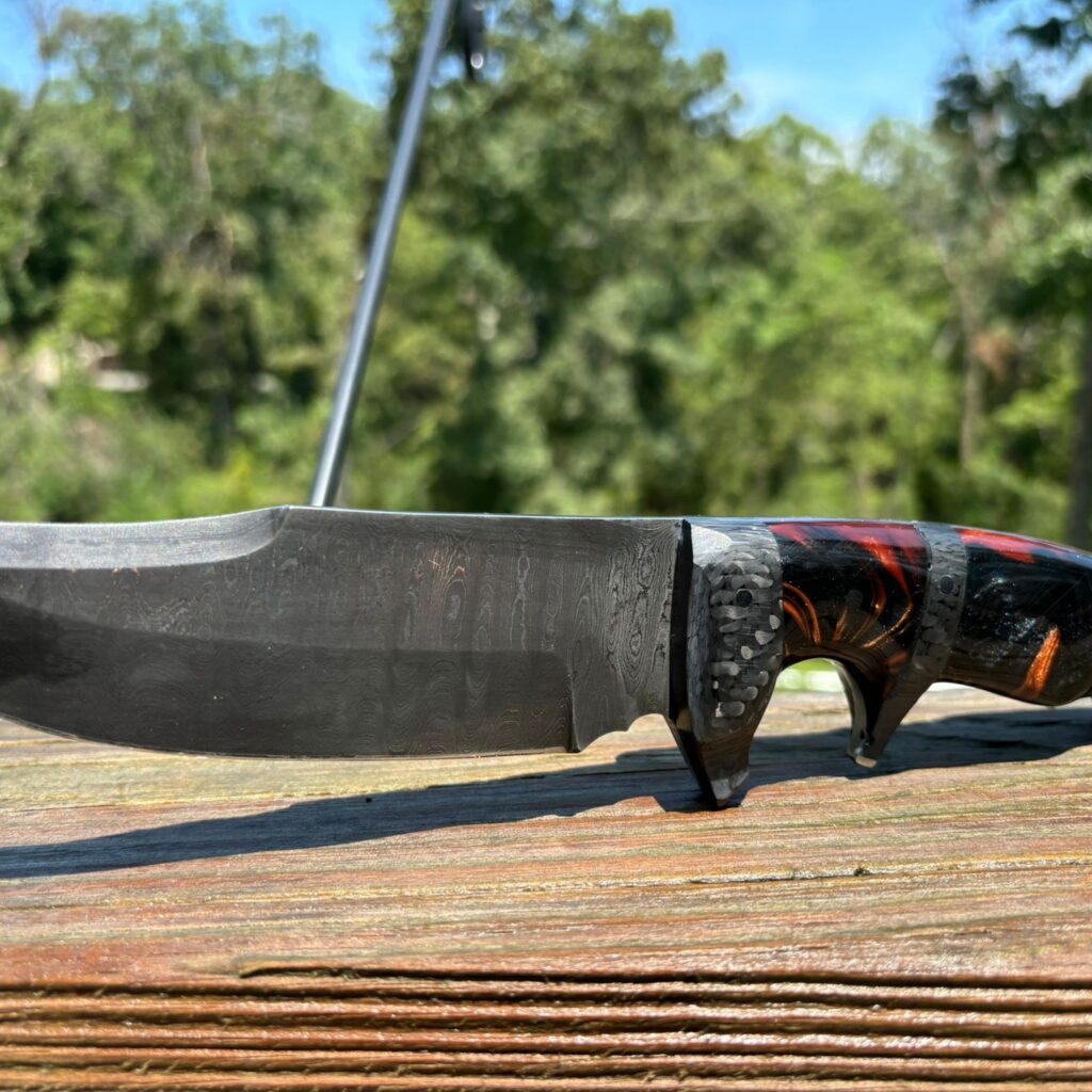 Handcrafted with precision, this knife proudly boasts a 6-inch blade, forged from Damascus steel in the iconic clip point sub-hilt bowie style. Paying attention to the details, the spine is meticulously hand-tooled with a complex file work. With an overall length of 11 inches, the handle is a harmonious blend of copper and black polyester resin, perfectly paired with a carbon fiber bolster. A testament to craftsmanship and dedication, this is more than just a knife – it’s a trusted companion.