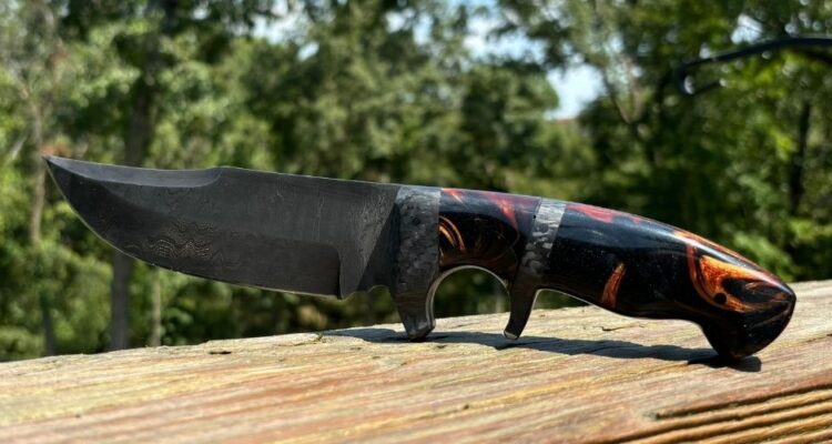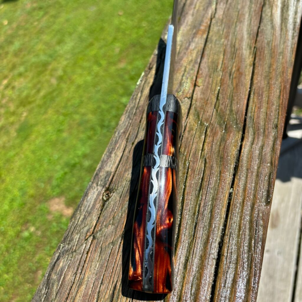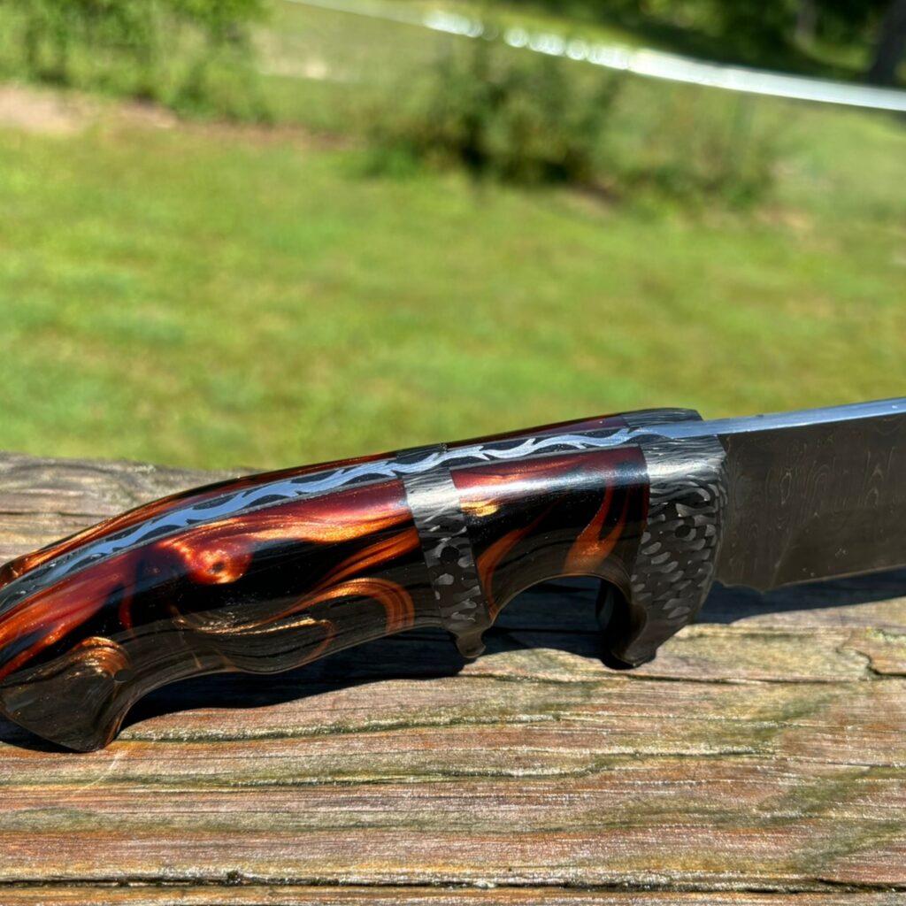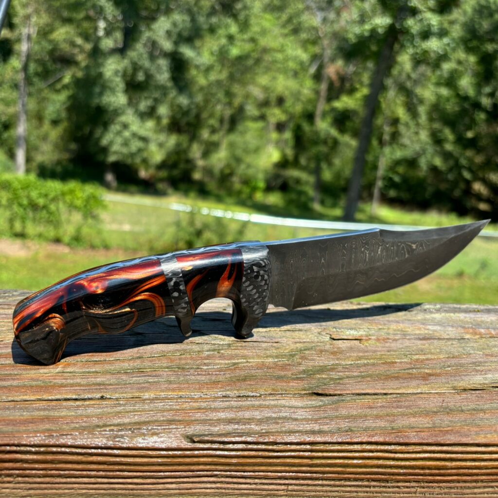Handcrafted with precision, this knife proudly boasts a 6-inch blade, forged from Damascus steel in the iconic clip point sub-hilt bowie style. Paying attention to the details, the spine is meticulously hand-tooled with a complex file work. With an overall length of 11 inches, the handle is a harmonious blend of copper and black polyester resin, perfectly paired with a carbon fiber bolster. A testament to craftsmanship and dedication, this is more than just a knife – it’s a trusted companion.