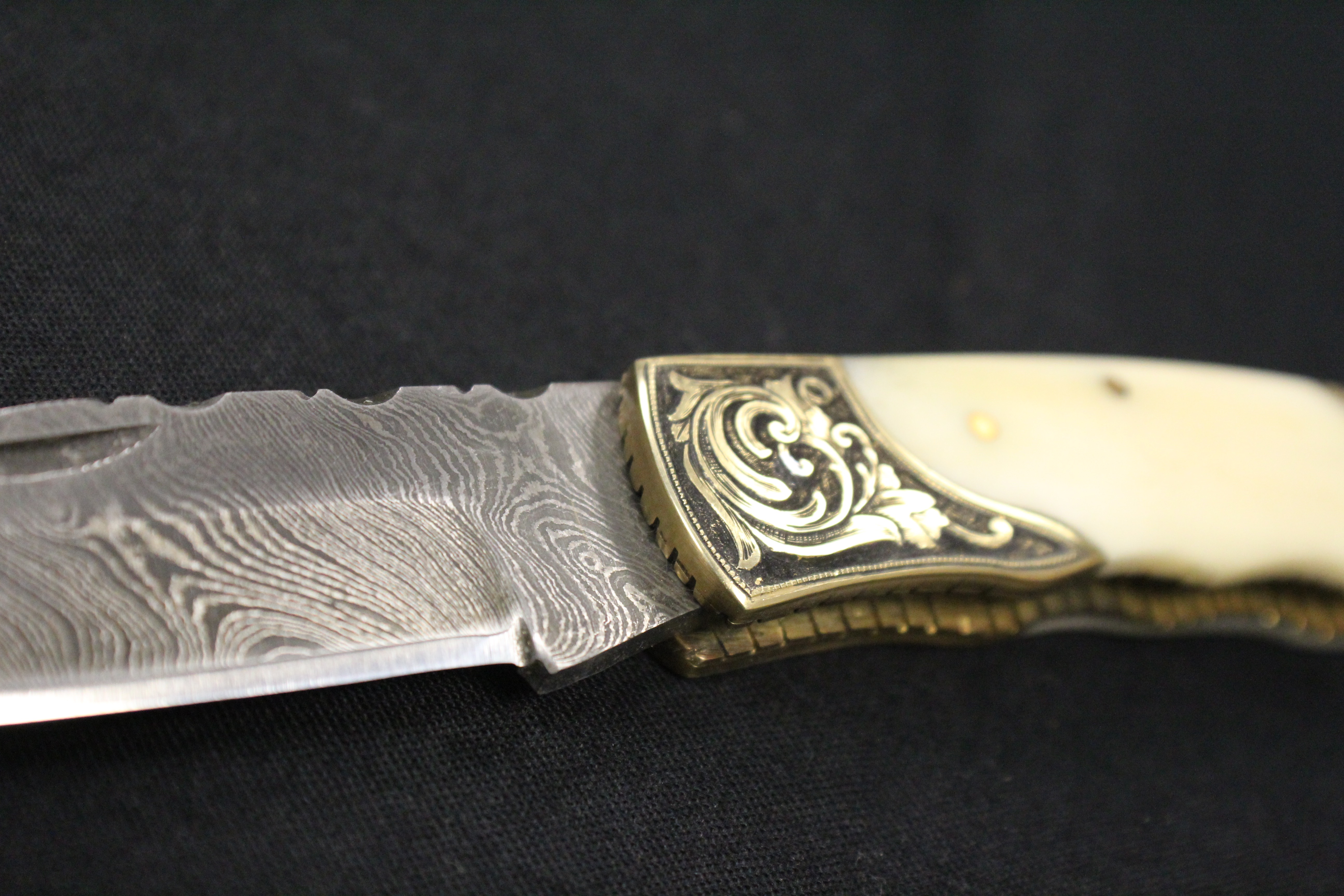 This is my new favorite piece! It is a folding Damascus steel drop point knife with a bone handle and brass guards.