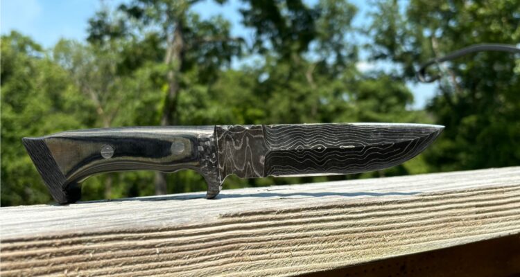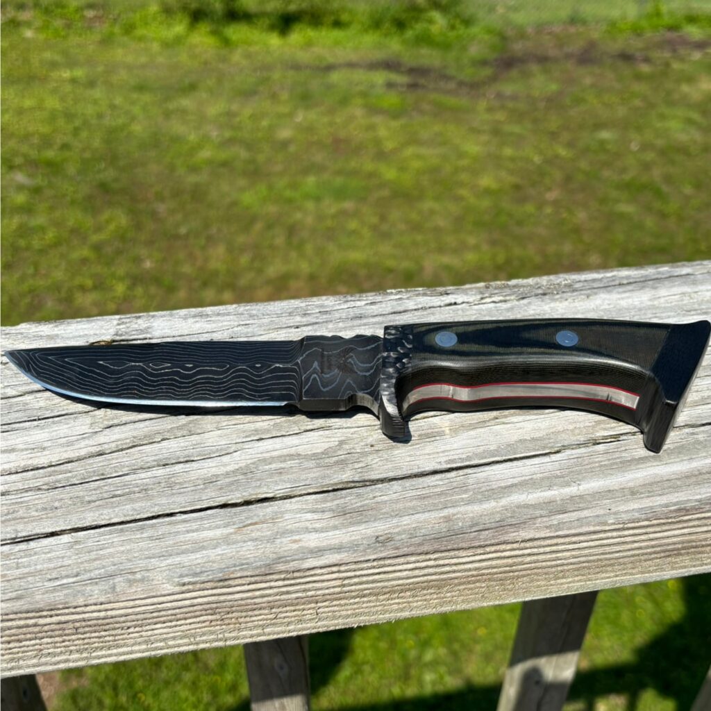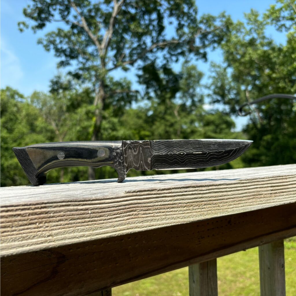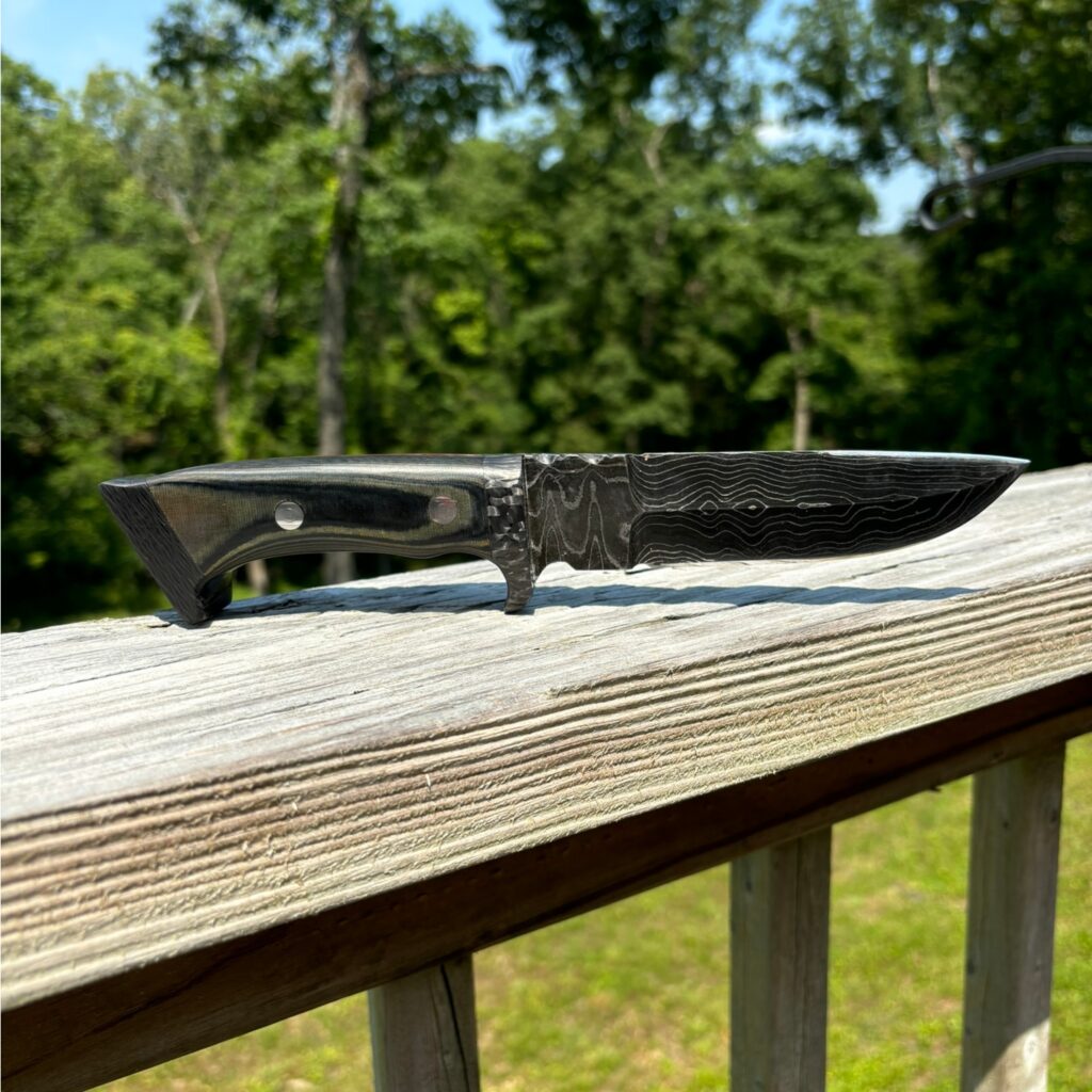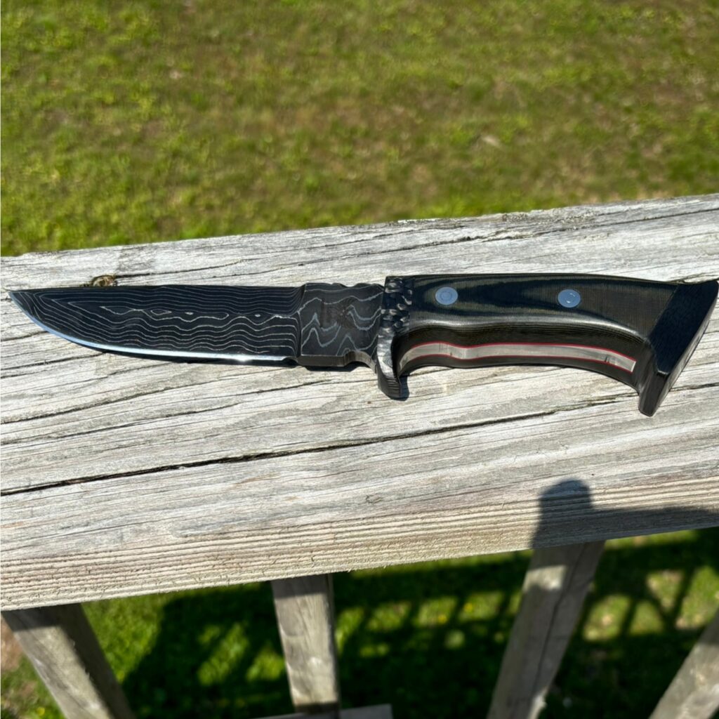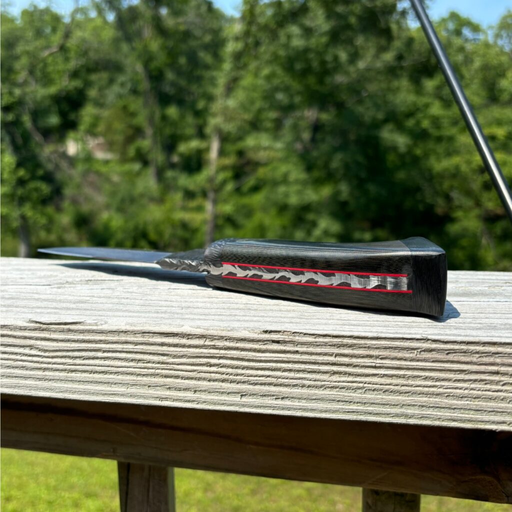 A Damascus Steel blade featuring a thumb grip on the spine, detailed file work along the back of the handle, and an overall length of 10 inches. The handle is crafted from green micarta with carbon fiber bolster and end cap, accentuated by red felt liners that highlight the intricate file work.