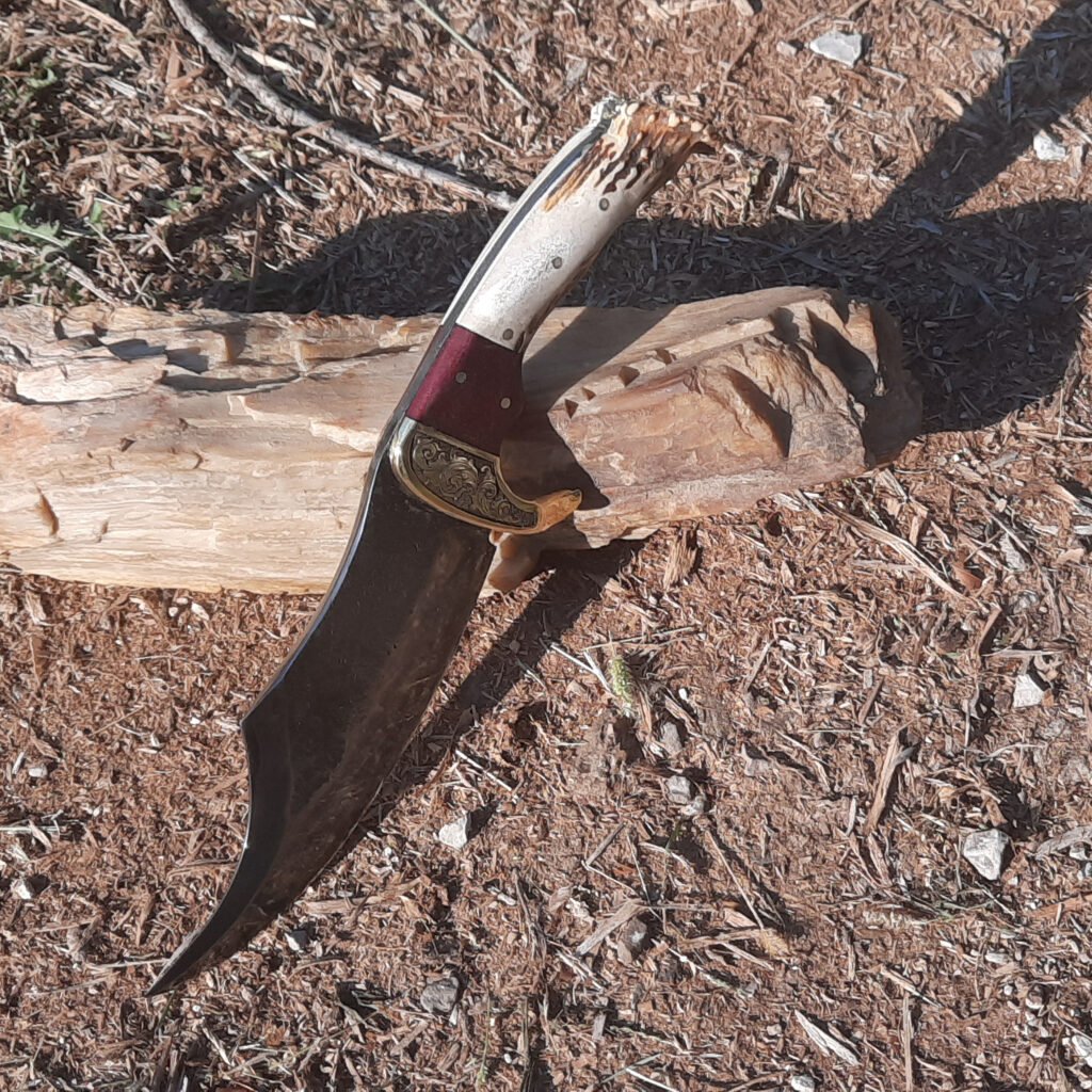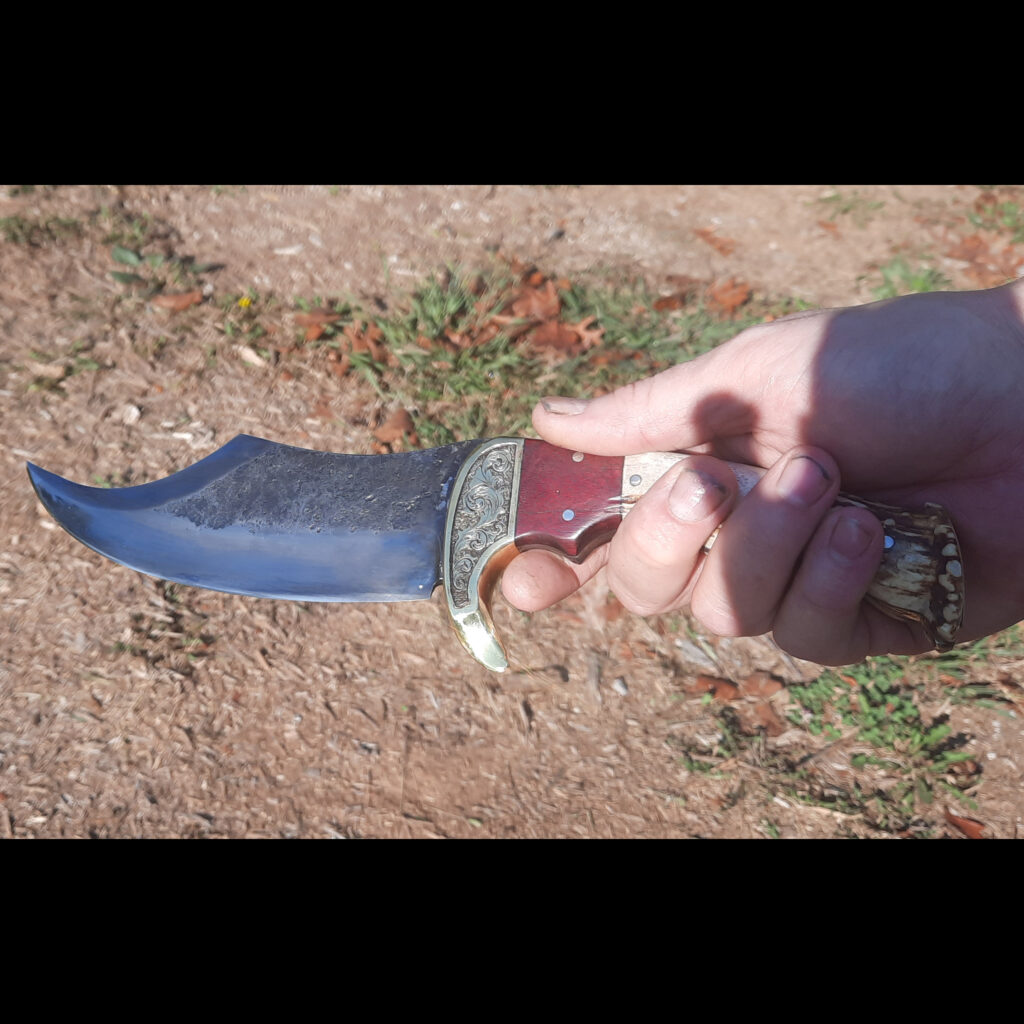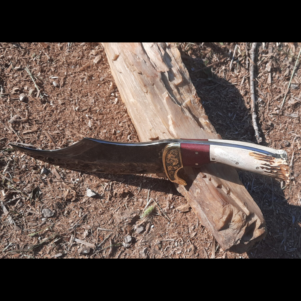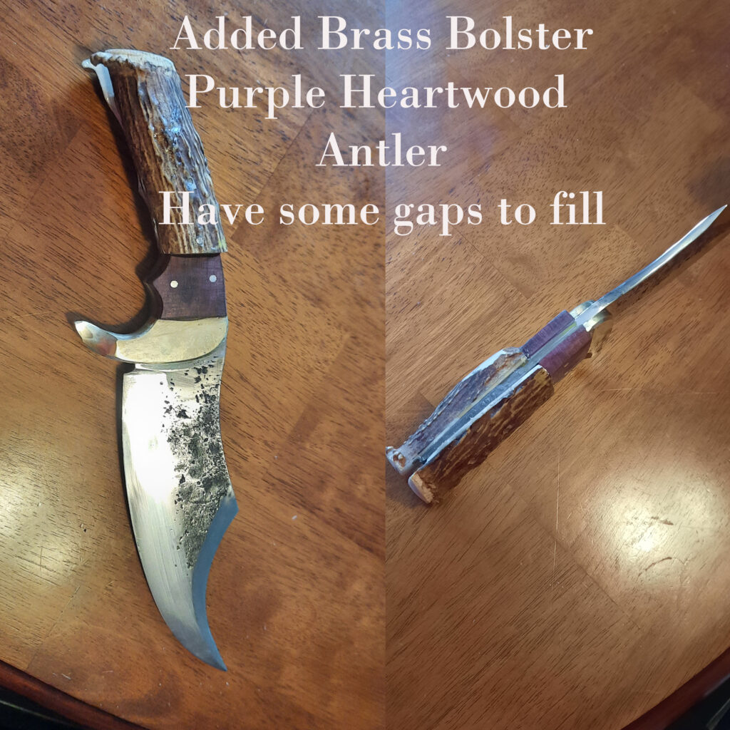 The knife took a fair amount of grinding and hammering but I’m happy with the end result. The knife has a hand engraved brass bolster with purple heartwood and antler. I left the texture alone on part of the knife blade, I liked the rough look it gave the piece.