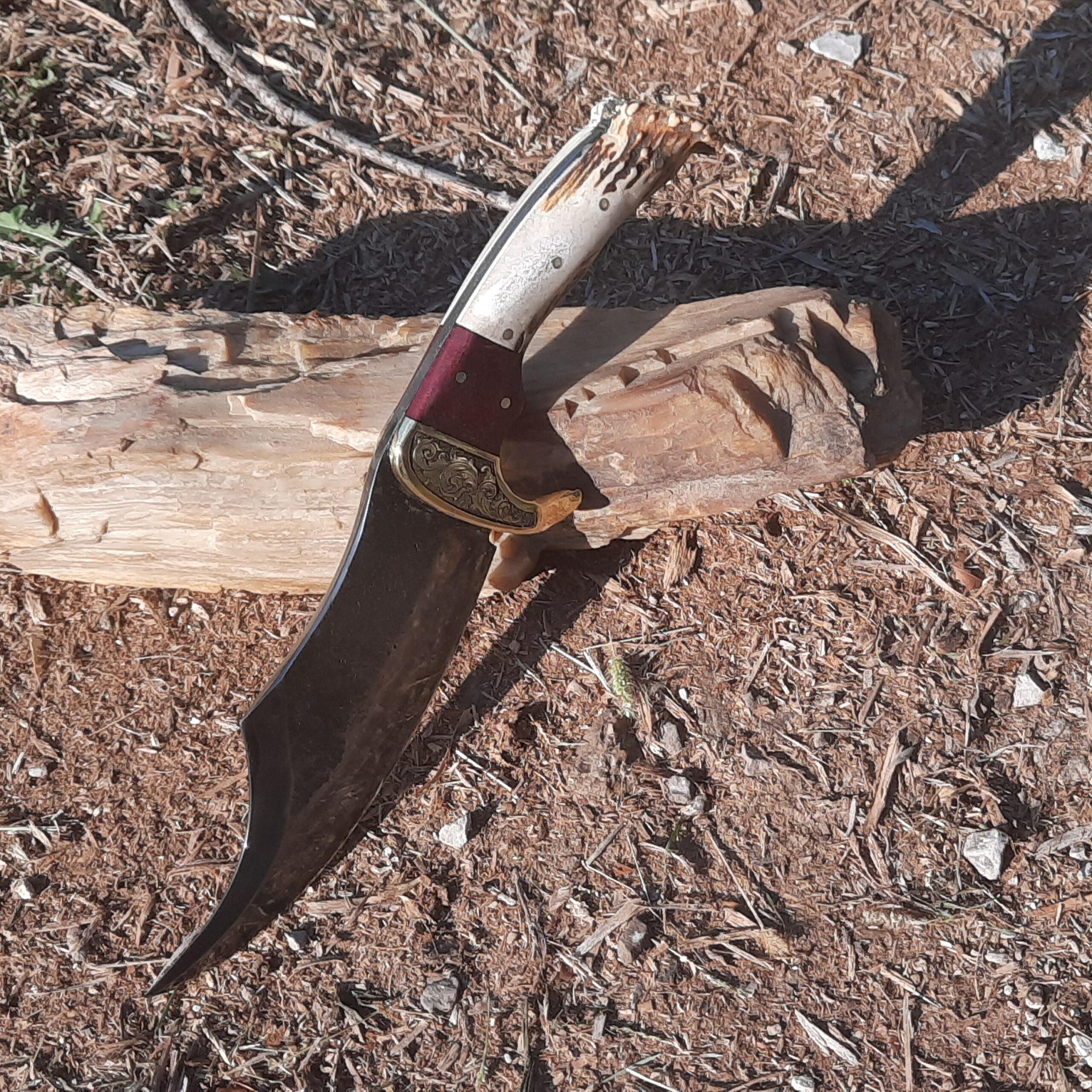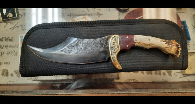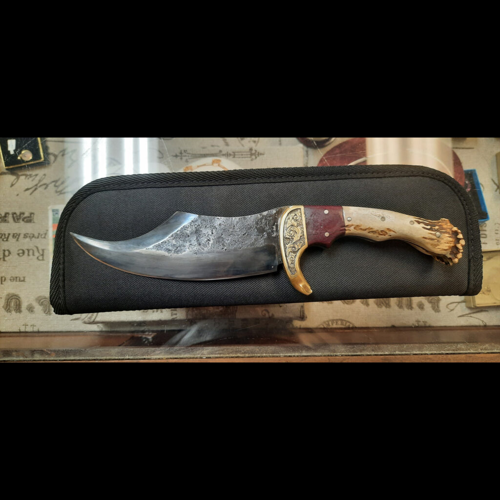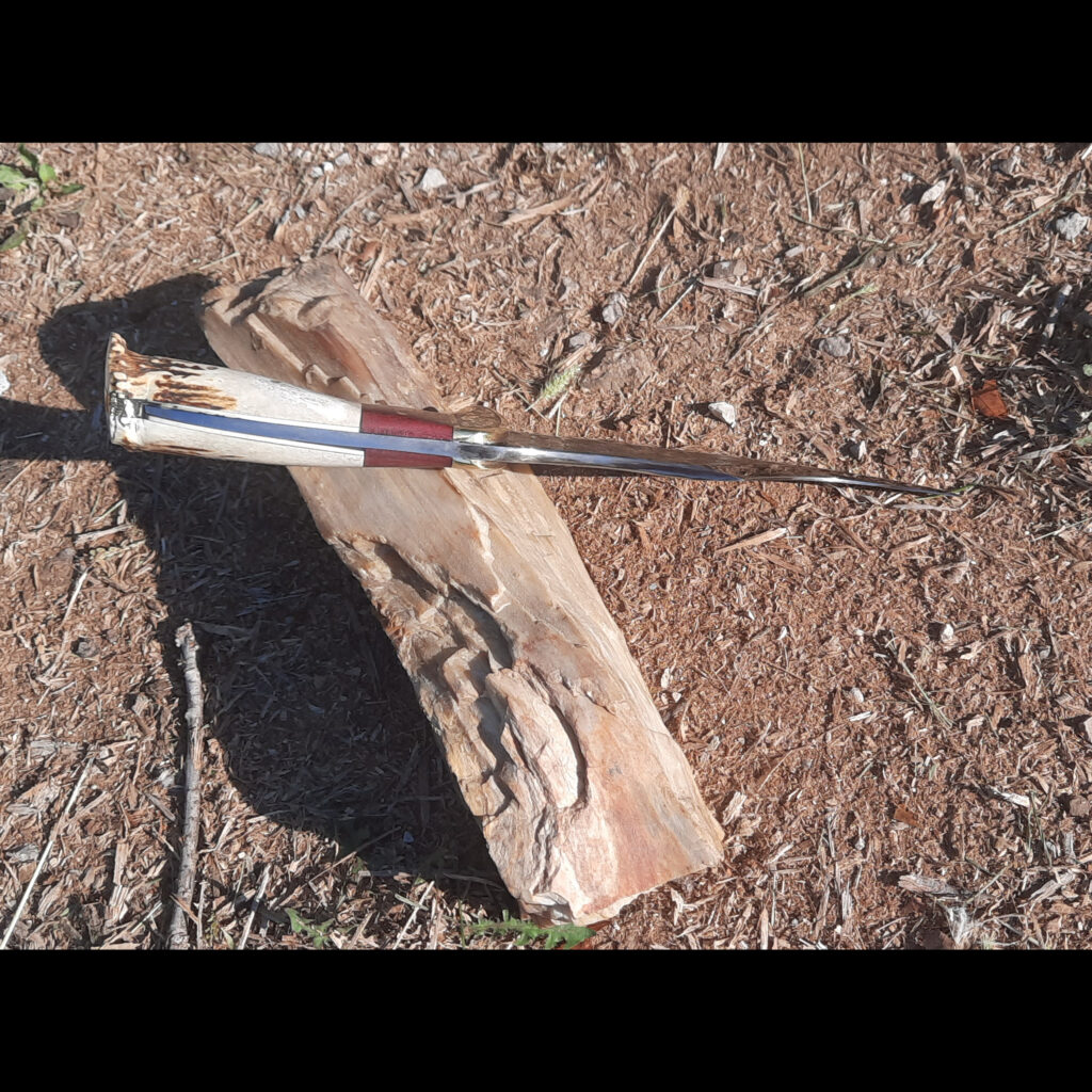 The knife took a fair amount of grinding and hammering but I’m happy with the end result. The knife has a hand engraved brass bolster with purple heartwood and antler. I left the texture alone on part of the knife blade, I liked the rough look it gave the piece.