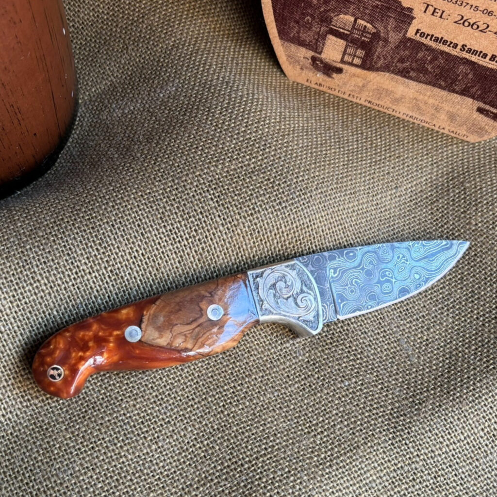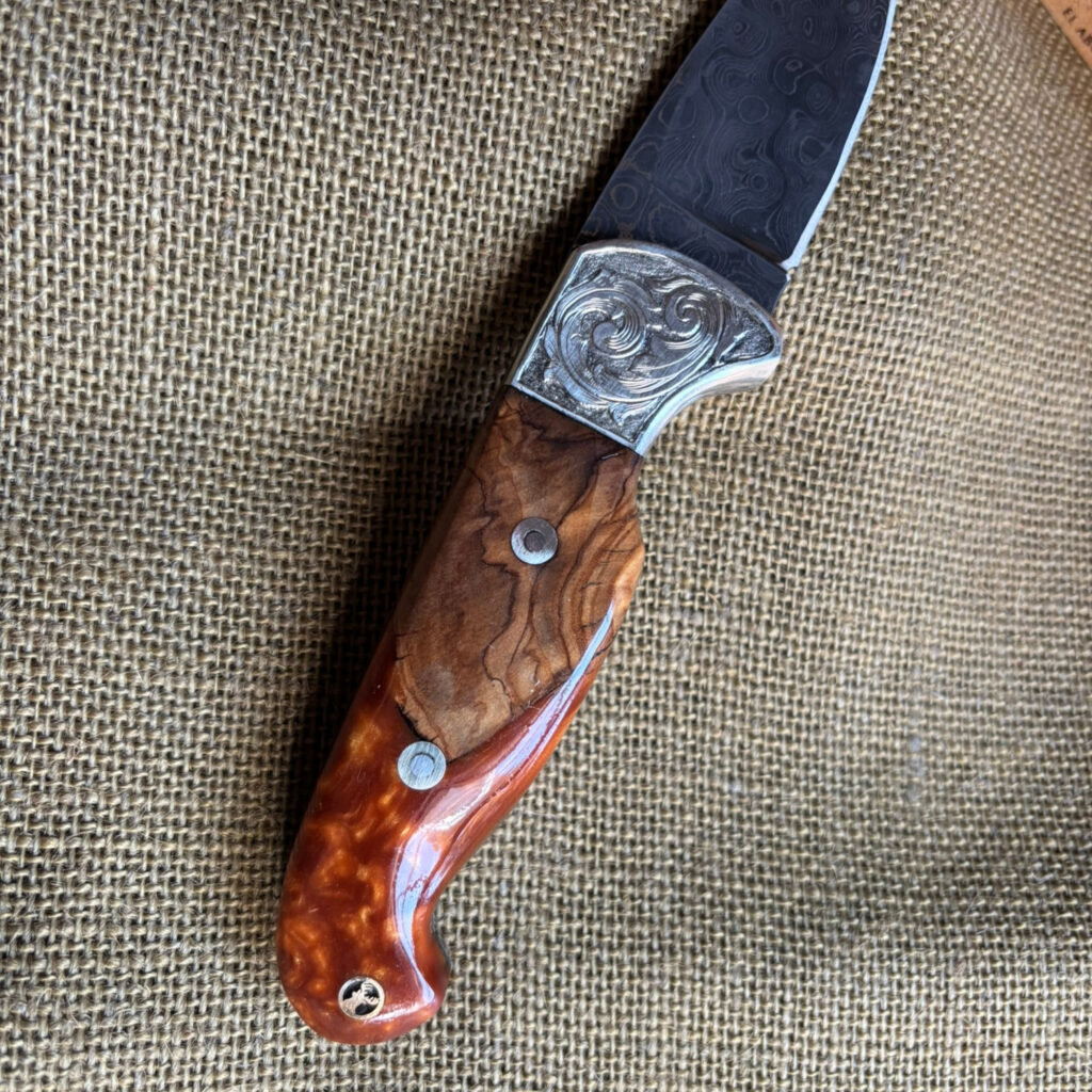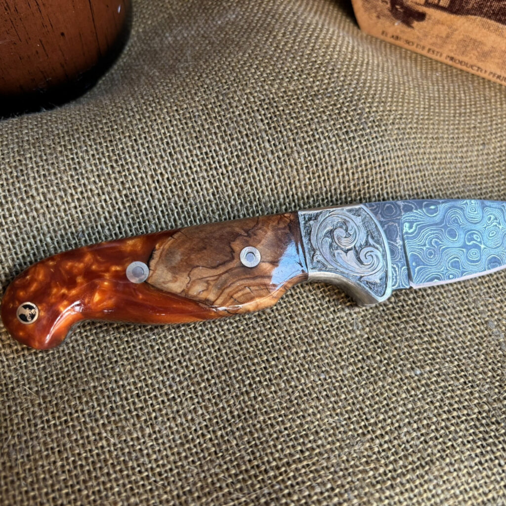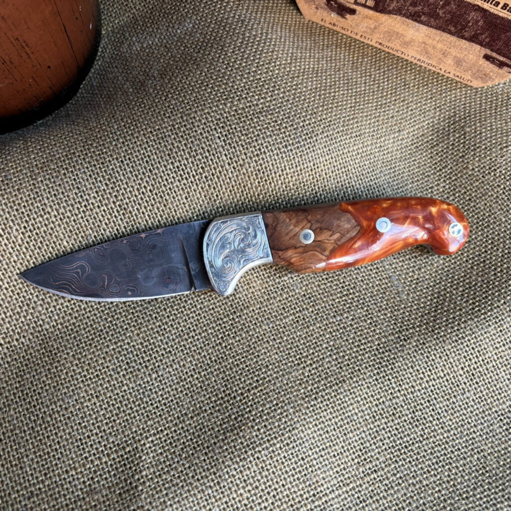 Introducing your trusty companion, the Drop Point Camp Knife. Forged from Damascus Steel, this blade is as reliable as it is striking. Nickel bolster, meticulously hand-engraved, provides a robust counterpoint. The handle? Crafted from stabilized maple burl wood and acrylic, showcasing the interplay of nature and manmade brilliance. Assembled with loveless fasteners and a decorative stag mosaic pin, everything is held together with a craftsman’s assurance. Admire the hand file work gracing the spine, an artistic touch on a practical tool. With a blade length of 3 inches and an overall length of 8 inches, it’s the perfect balance of wieldy and robust. I’ve rolled up my sleeves and crafted this knife with my own hands, and I’m proud to pass it onto yours.