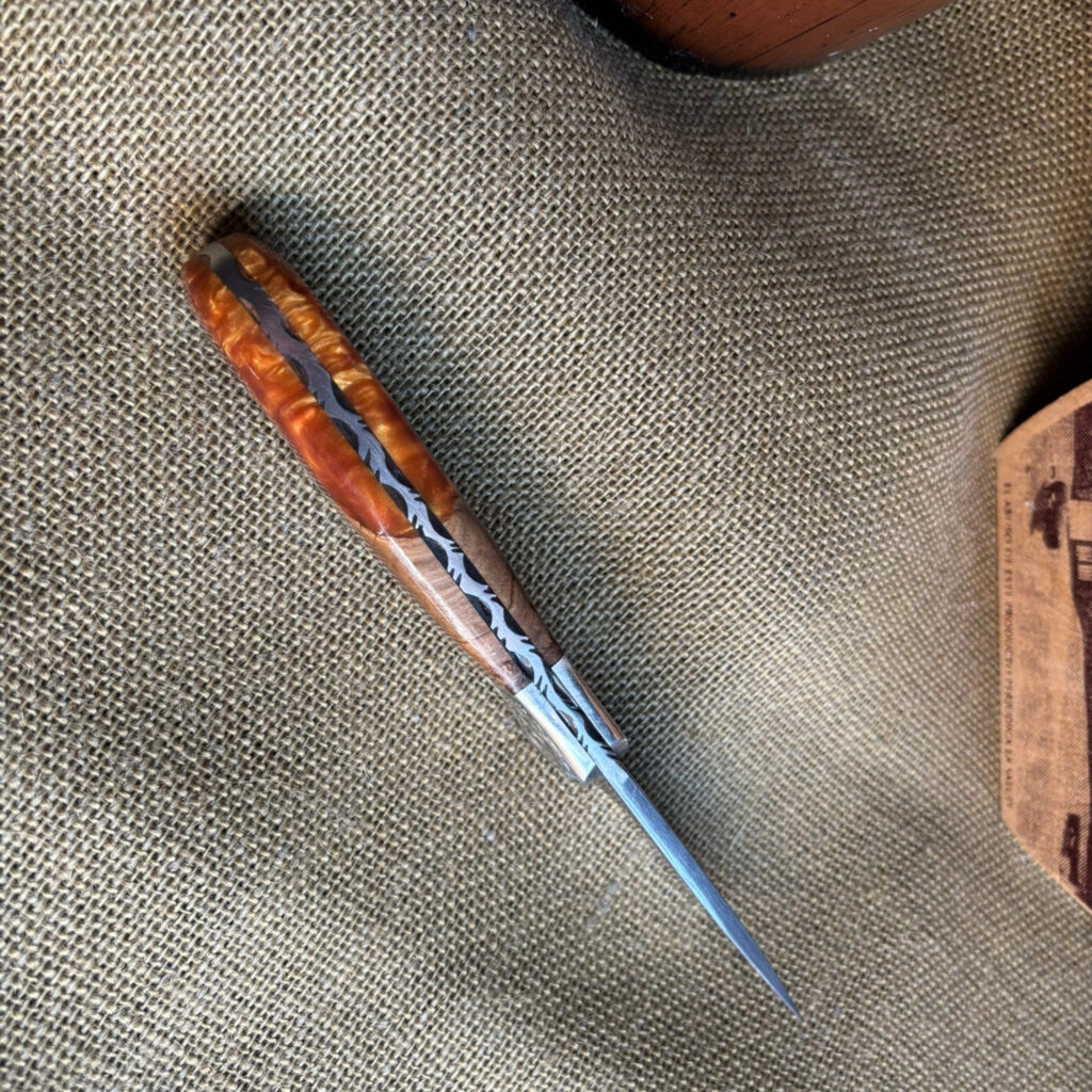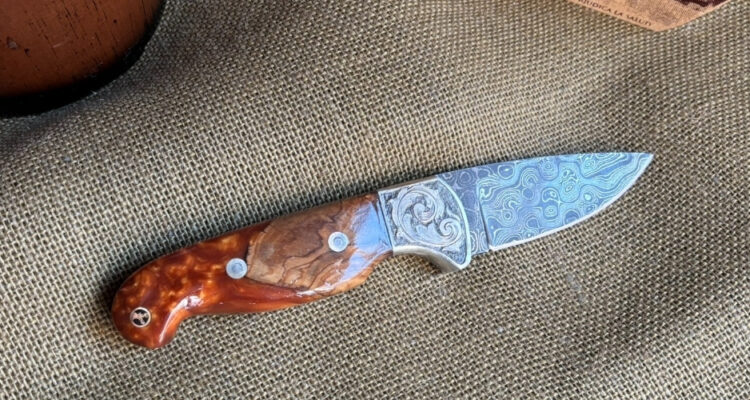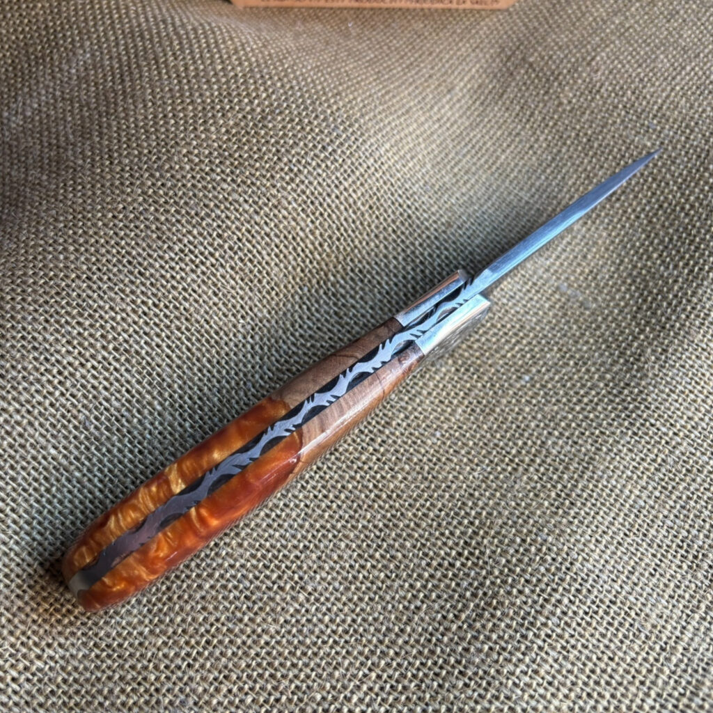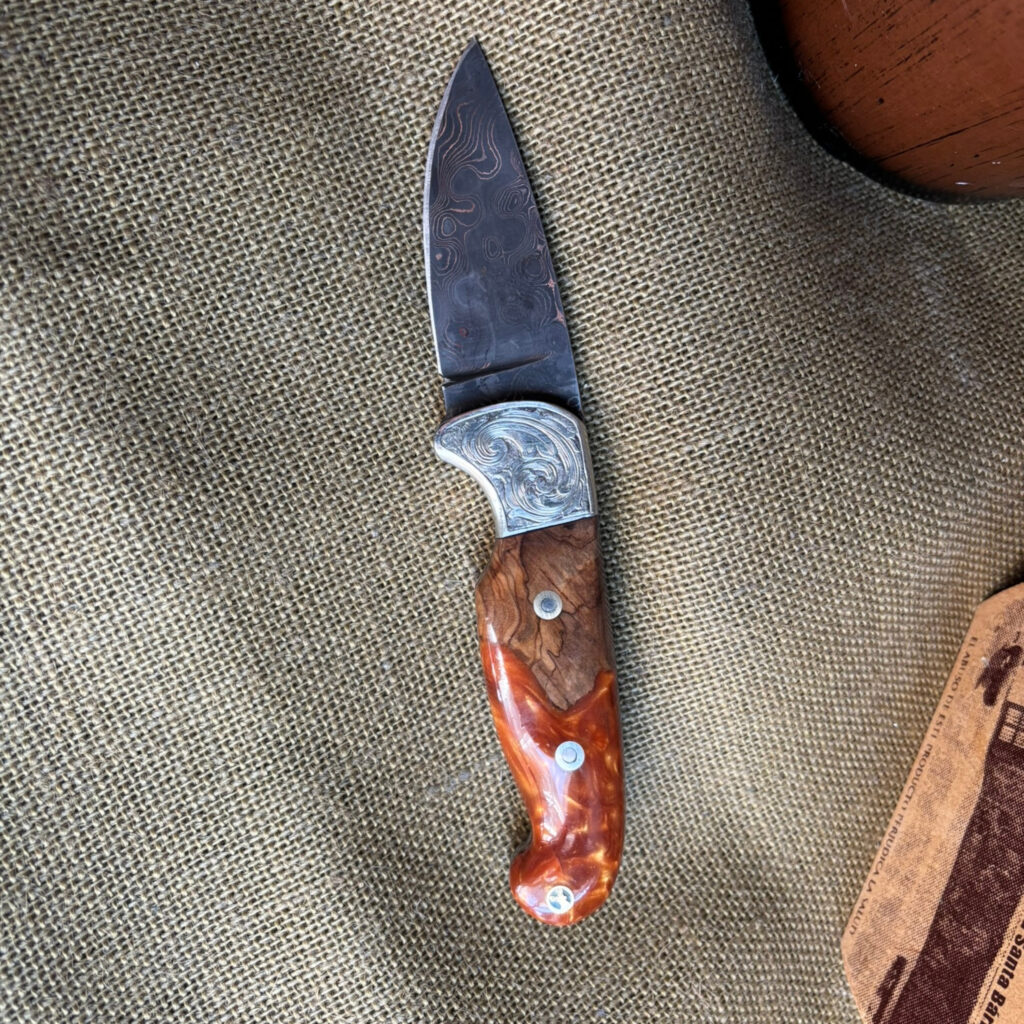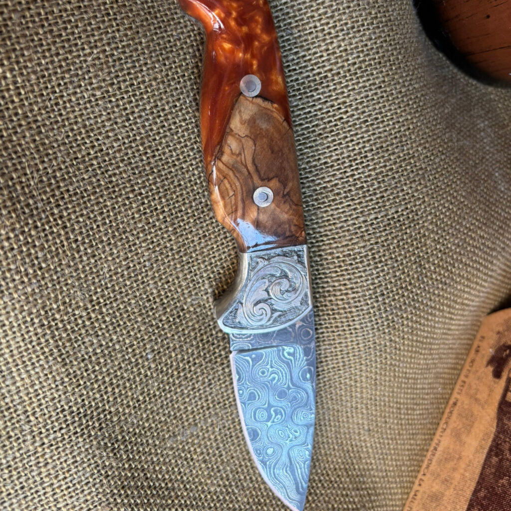 Introducing your trusty companion, the Drop Point Camp Knife. Forged from Damascus Steel, this blade is as reliable as it is striking. Nickel bolster, meticulously hand-engraved, provides a robust counterpoint. The handle? Crafted from stabilized maple burl wood and acrylic, showcasing the interplay of nature and manmade brilliance. Assembled with loveless fasteners and a decorative stag mosaic pin, everything is held together with a craftsman’s assurance. Admire the hand file work gracing the spine, an artistic touch on a practical tool. With a blade length of 3 inches and an overall length of 8 inches, it’s the perfect balance of wieldy and robust. I’ve rolled up my sleeves and crafted this knife with my own hands, and I’m proud to pass it onto yours.