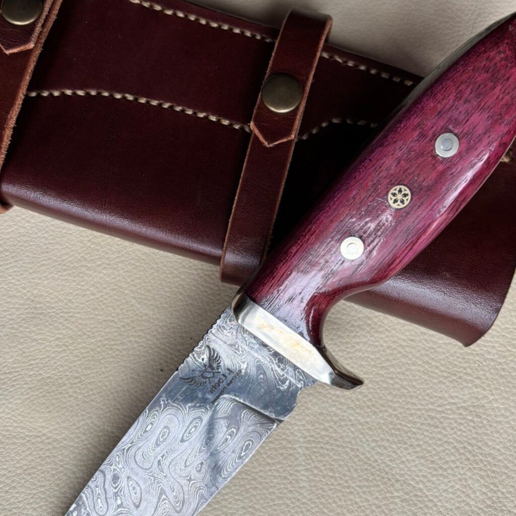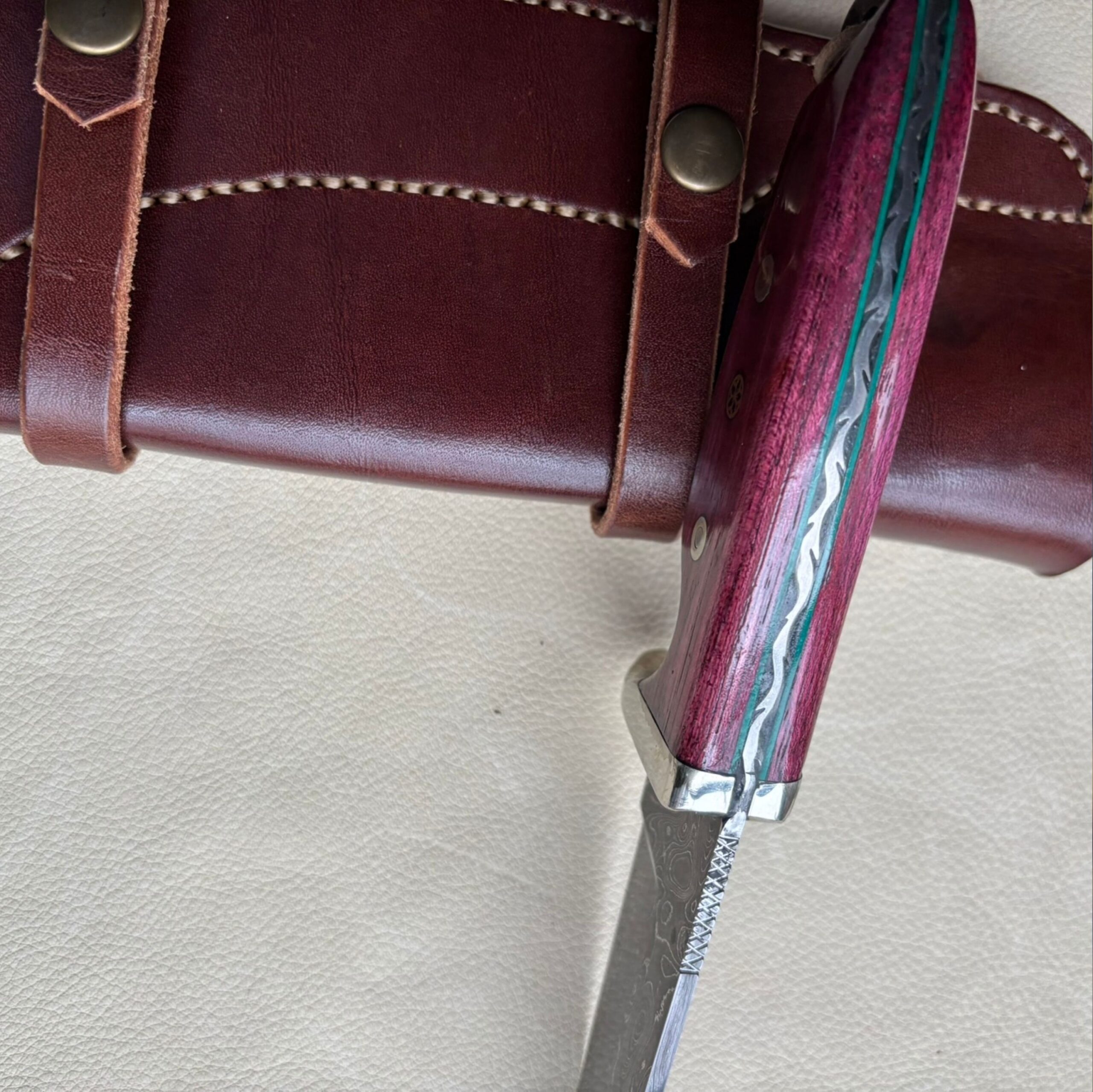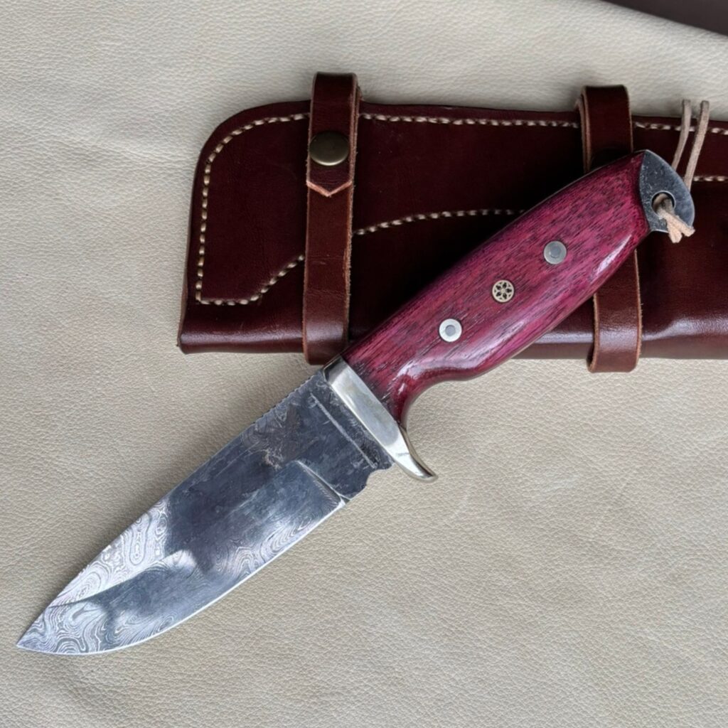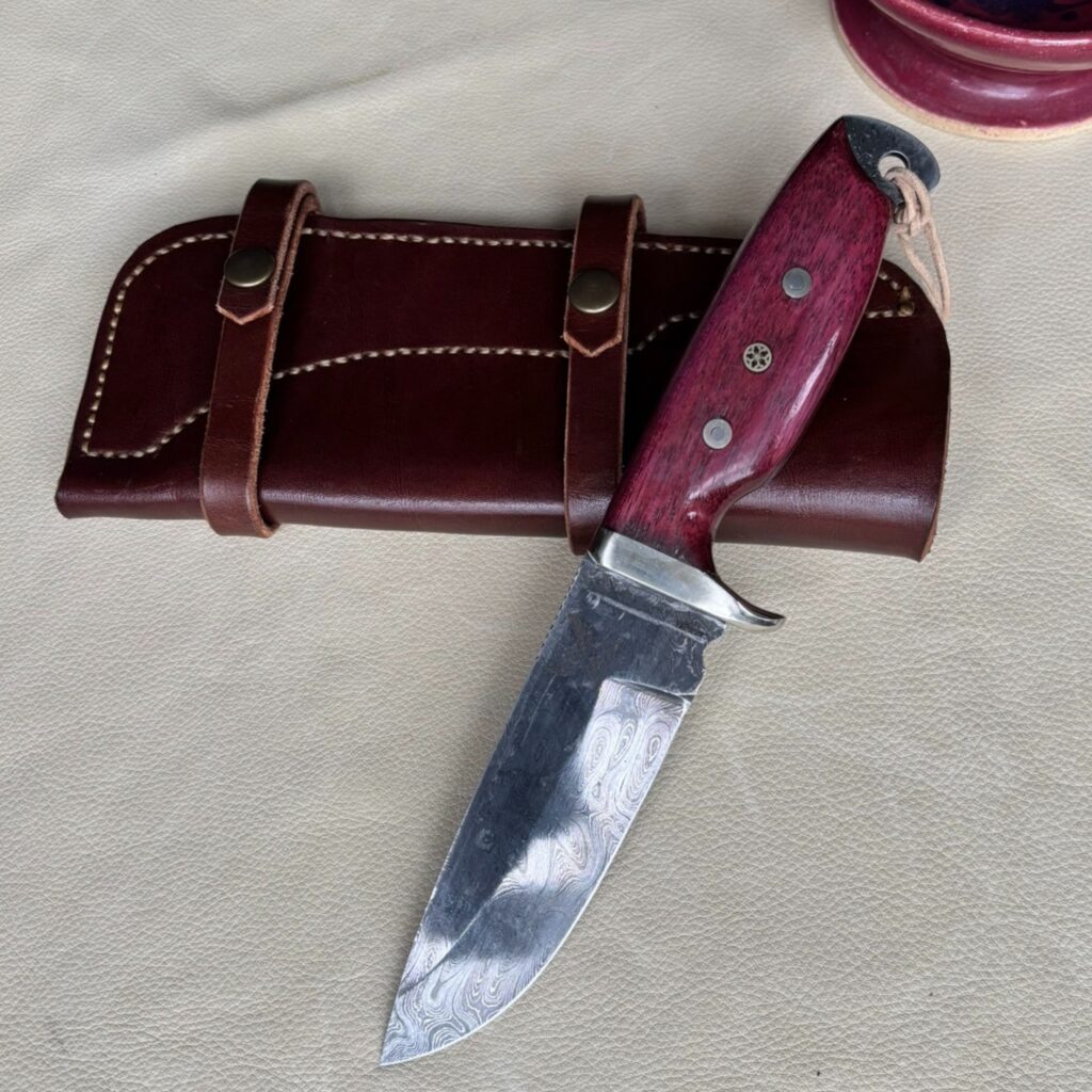 Meet the Drop Point Knife with Purple Heart Wood Handle. Crafted with Damascus Steel, the blade boasts a solid, dependable cutting edge. Sitting atop the blade is a polished nickel bolster, shining bright and true.