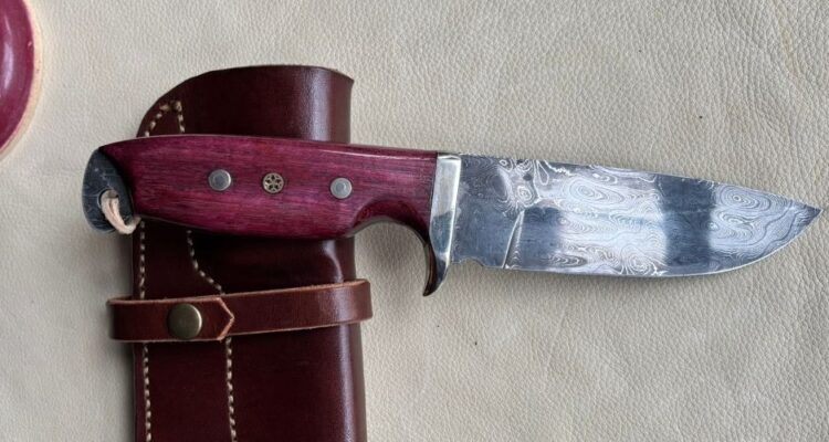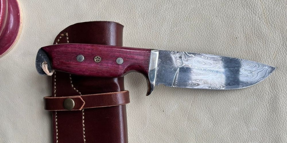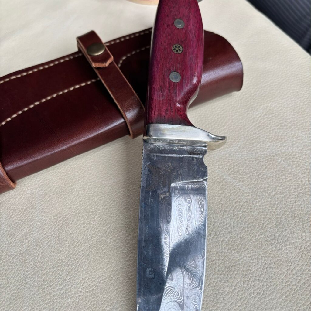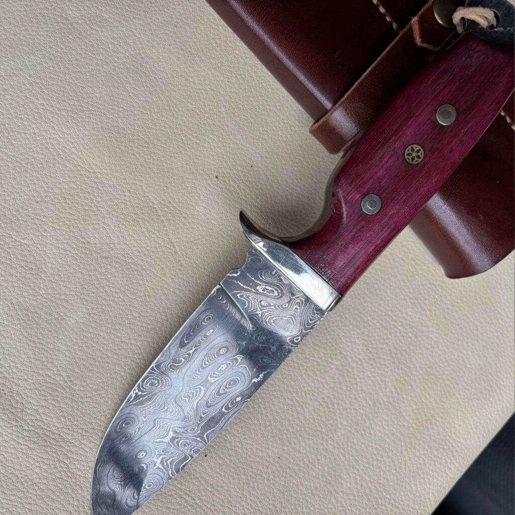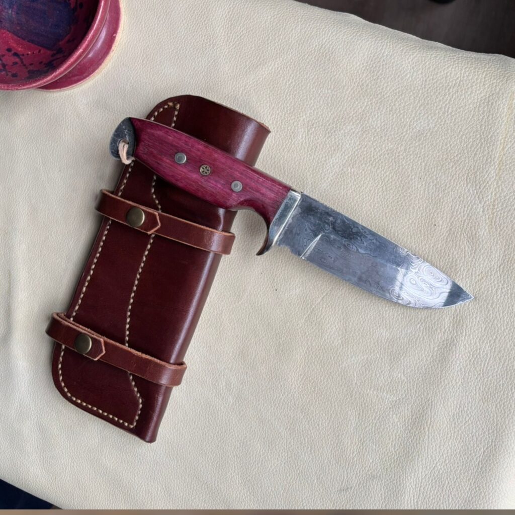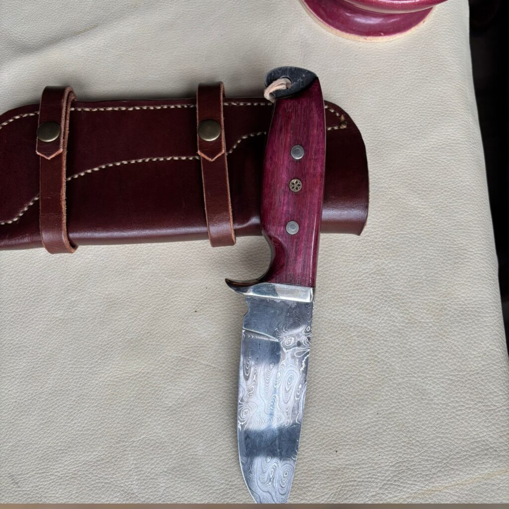 Meet the Drop Point Knife with Purple Heart Wood Handle. Crafted with Damascus Steel, the blade boasts a solid, dependable cutting edge. Sitting atop the blade is a polished nickel bolster, shining bright and true.