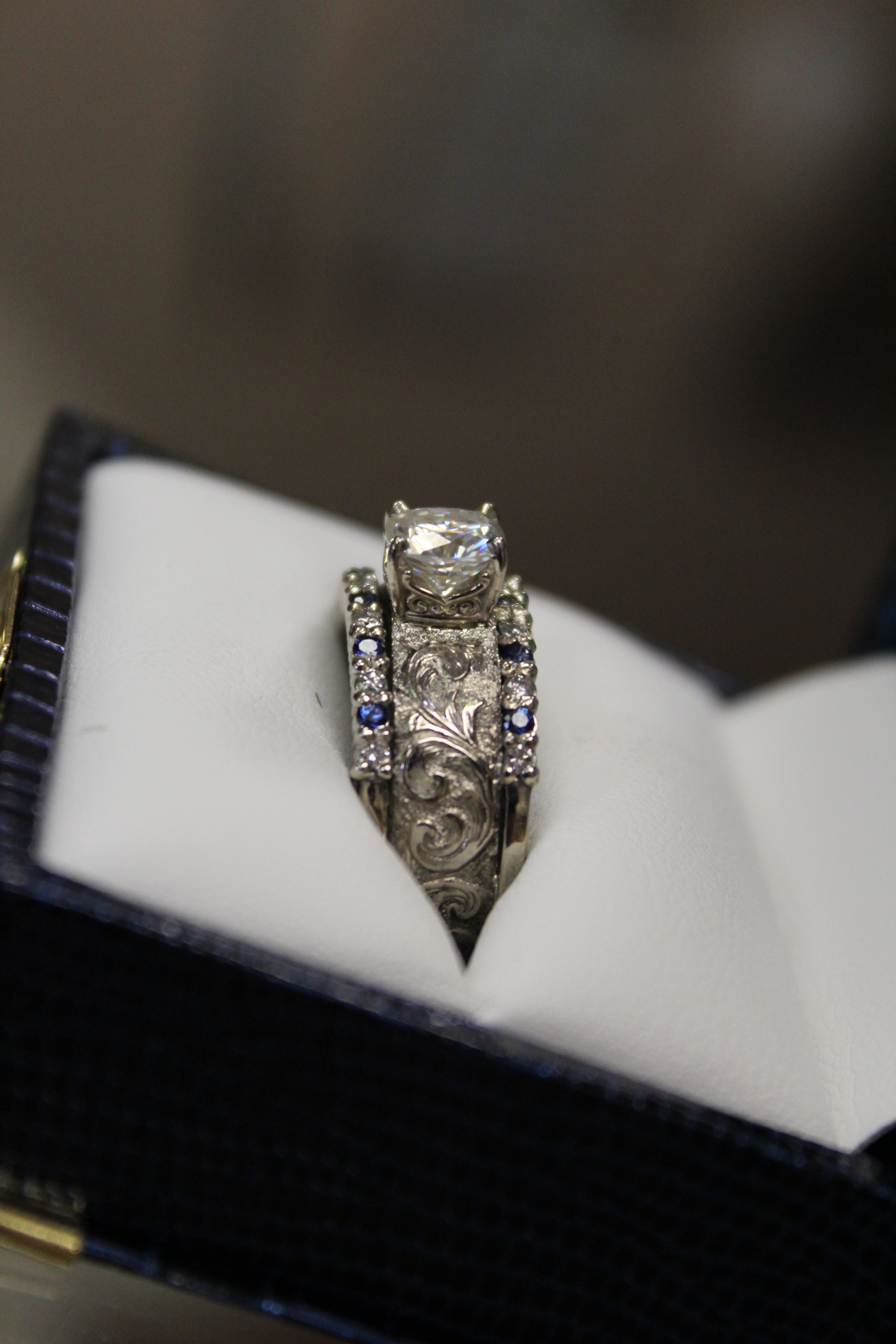 This is a white gold and hand-engraved diamond and sapphire wedding set I made for some very dear friends of mine. They had lost the large stone out of their original set and she had been using an inexpensive ring they bought at a department store. They commissioned me to make them “something nice” and gave me carte blanche to create the piece.
