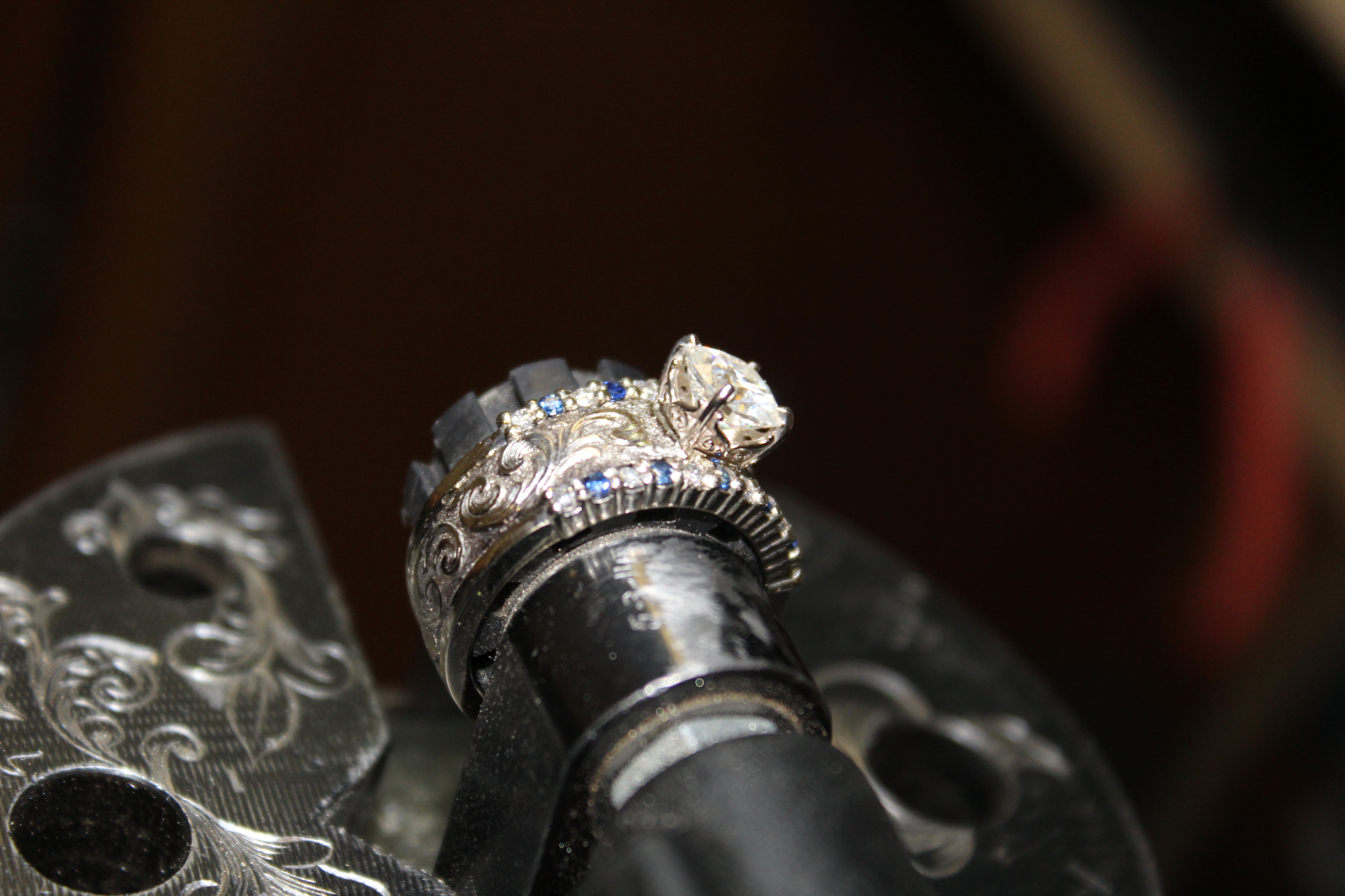 It is all hand-engraved with a light, flowing and unique style with a one-carat antique cushion-cut stone. It has a beautiful fire in the sunlight. The stones on the side are blue sapphires and diamonds. These diamonds were in her original wedding set he had first gotten her.