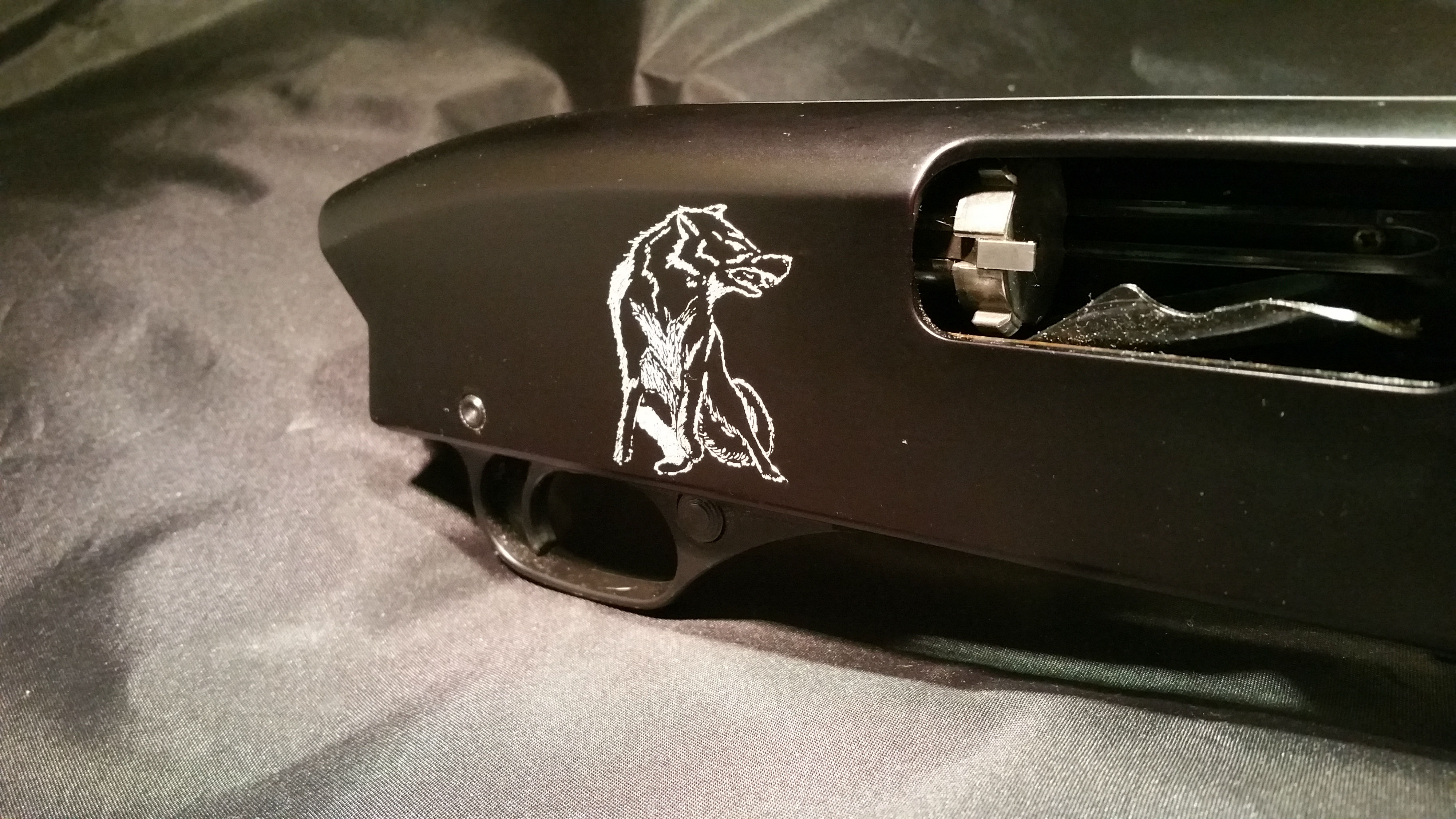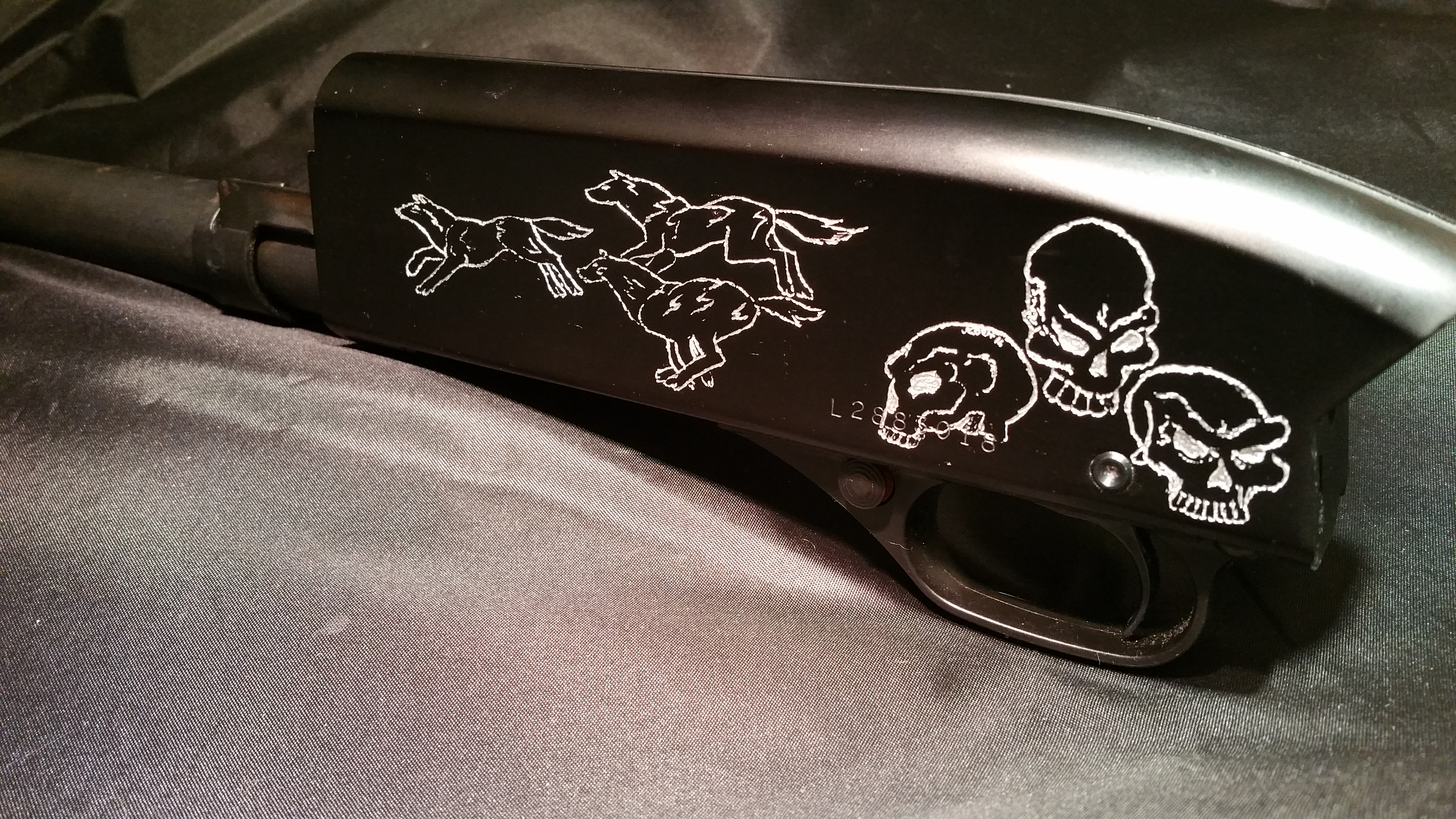 Poked around at drawings and sketches until I found the perfect style. I envisioned a snarling lone wolf on one side and pack running on the other with skulls in the foreground. This piece has a black cerakote finish which is perfect for engraving. Cutting through the black reveals the bright aluminum underneath making the engraving pop out in sharp relief.