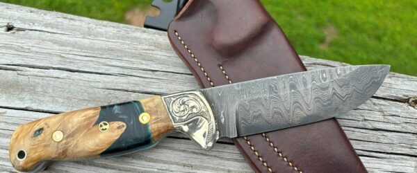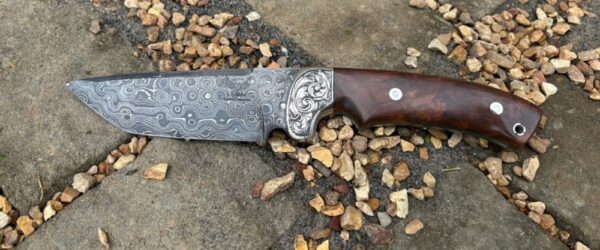 Thuya Burl Damascus Tanto – Hand Engraved Bolster 🗡 Thuya Burl Damascus Tanto – Hand Engraved Bolster “Where Craft Meets Character” Some knives come together in a ...