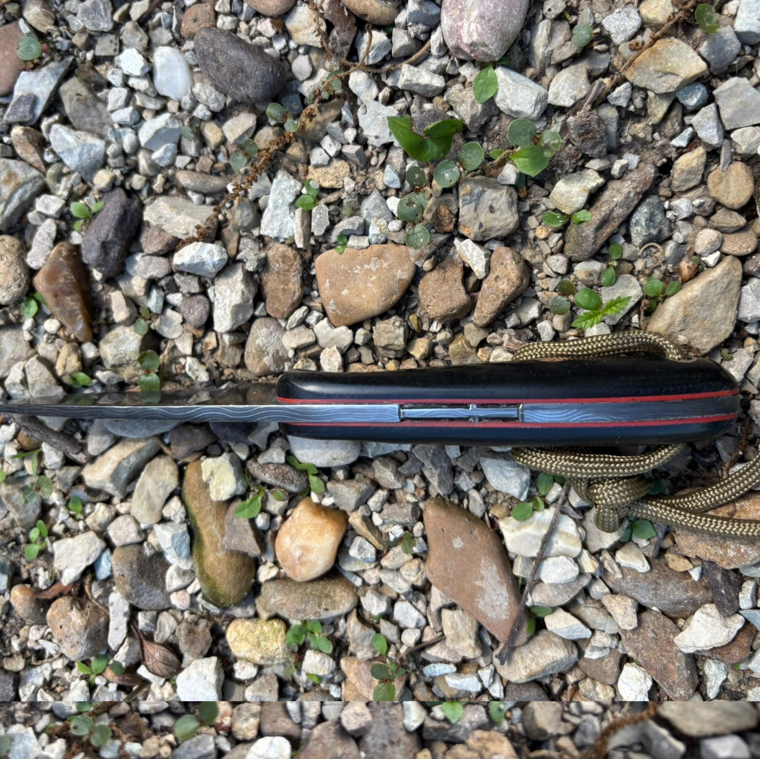 The handle is black G10 — durable, weather-resistant, and shaped for a solid grip. It’s paired with red felt liners that add just enough contrast to give the piece depth without drawing attention away from the blade. Copper and brass Loveless fasteners bring everything together, adding strength and a touch of warmth to the overall look.